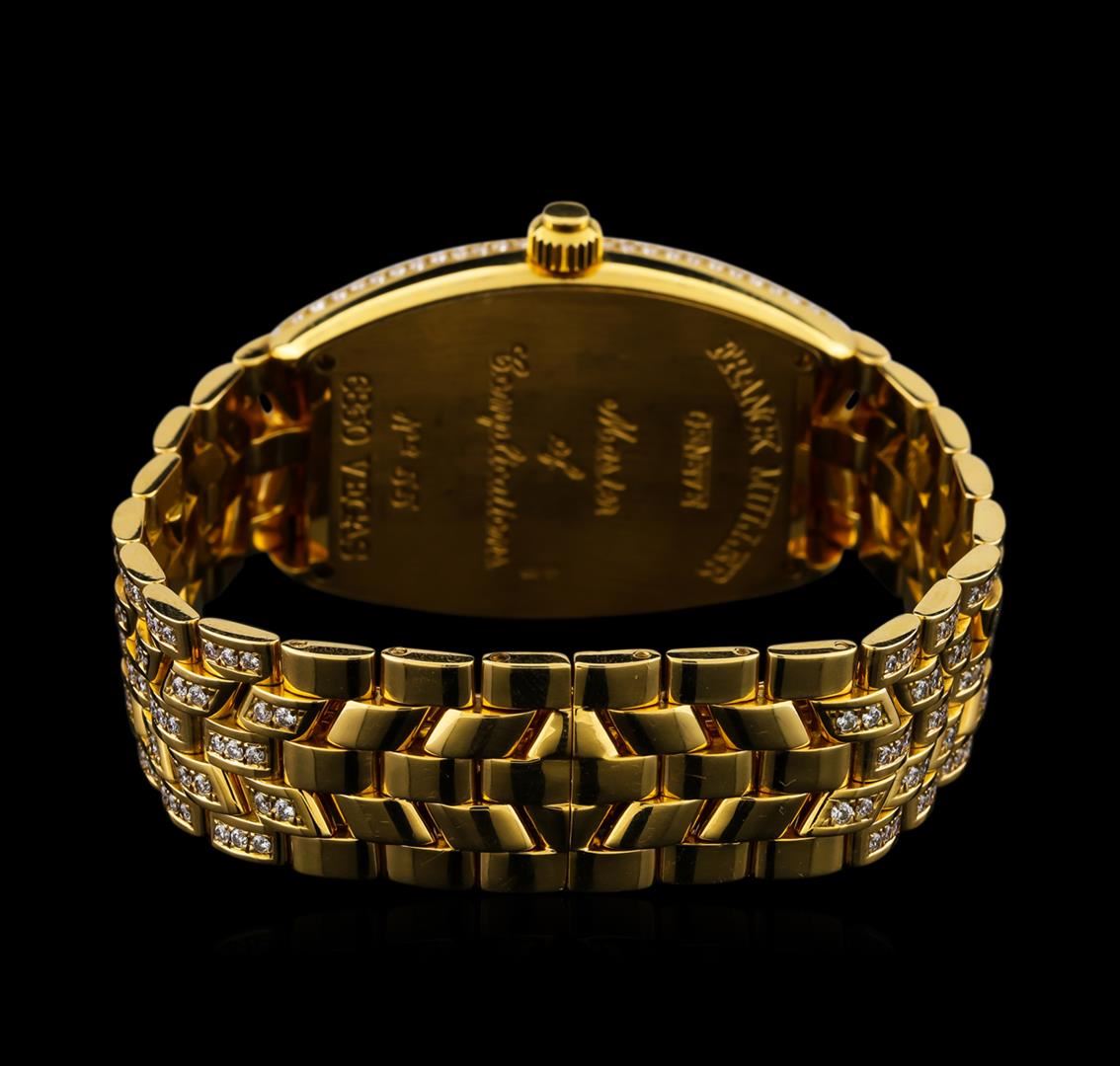 One Franck Muller Vegas watch featuring: Case: 47mm x 34mm 18KT yellow gold. Dial: Silver with roulette wheel, Arabic numerals. Bezel: 18KT yellow gold set with diamonds. Bracelet: 18KT yellow gold set with diamonds, gold deployment buckle. Movement: Automatic. Crystal: Sapphire. Condition: Very minor wear on crystal, case and bracelet, roulette wheel is functional, overall very good condition.