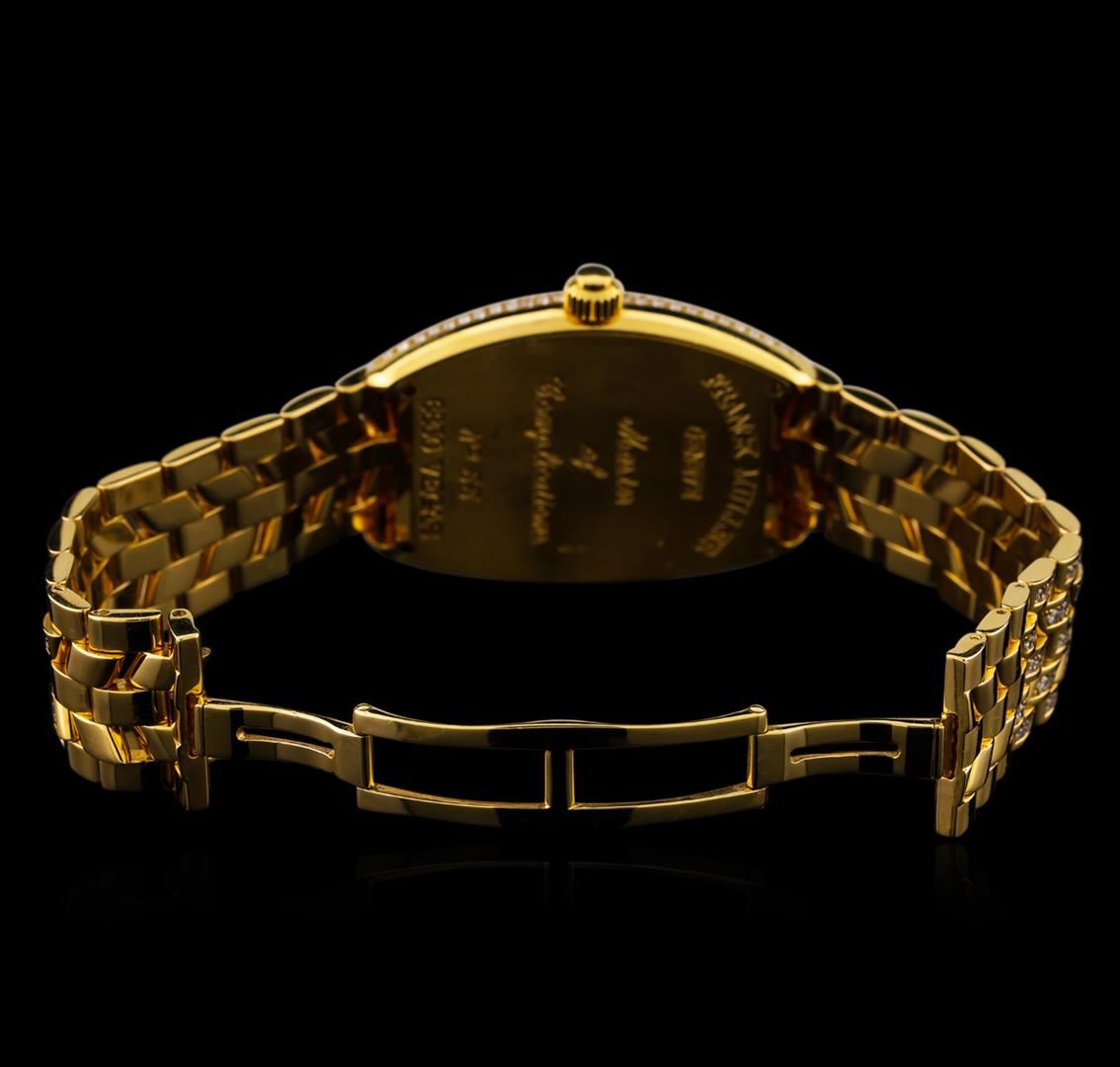 One Franck Muller Vegas watch featuring: Case: 47mm x 34mm 18KT yellow gold. Dial: Silver with roulette wheel, Arabic numerals. Bezel: 18KT yellow gold set with diamonds. Bracelet: 18KT yellow gold set with diamonds, gold deployment buckle. Movement: Automatic. Crystal: Sapphire. Condition: Very minor wear on crystal, case and bracelet, roulette wheel is functional, overall very good condition.