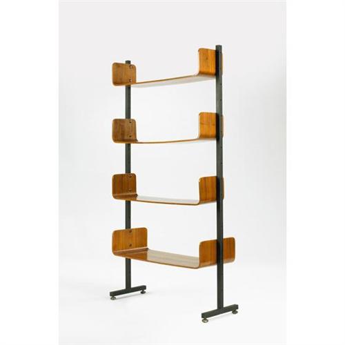 Franco Campo and Carlo Graffi<BR>bookshelf<BR>Home<BR>Italy, c. 1959<BR>mahogany, enameled steel<BR>36 w x 13.25 d x 68 h inches<BR>Literature: <BR><i>Il Mobile Italiano Degli Anni '40 e '50</i>, de Guttry and Maino, pg. 74 illustrates variation in vintage advertisement<BR><BR>Condition of the item is not included in this description. Condition reports are available from Wright upon request. Wright strongly recommends that you review a condition report for each item on which you plan to bid.