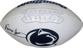 Before leading the Pittsburgh Steelers to their first Super Bowl title, Franco Harris was proud to be a Penn State Nittany Lion. After being a first round draft pick for Pittsburgh, Harris played in eight Pro Bowls and rushed for 158 yards en route to MVP honors in Super Bowl IX. He rushed for 1,000 yards in nine seasons and eclipsed the 100 yard mark in 47 games. His career stats are impressive: 12,120 yards, 91 touchdowns rushing, 2,287 yards, 9 touchdowns receiving and 14,622 combined net yards. Franco Harris has hand signed this Penn State Nittany Lions White Logo Football. A MAB Hologram and Certificate of Authenticity from Athlon Sports. Minor spot on lower panel of ball, sold as is, no returns.