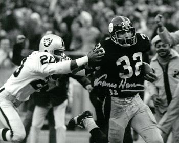 Catch the moment as Franco Harris makes his "Immaculate Reception" and takes the Pittsburgh Steelers to their first Super Bowl in 1972. Catch the Moment when Franco Harris made the impossible possible. With 22 seconds left on the clock during the 1972 AFC Divisional Playoff Game, Franco Harris rescued the football that had ricocheted off of the collision between teammate John Fuqua and Oakland Raiders safety Jack Tatum and then bolted 60 yards for the touchdown and the win. Harris has hand signed this memorable 8X10 photograph of the incredible Immaculate Reception that took the Steelers to their first Super Bowl. MAB Hologram and Certificate of Authenticity from Athlon Sports.
