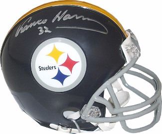 As a key member of the great Pittsburgh Steelers teams of the 1970s, Franco Harris played in eight Pro Bowls and rushed for 158 yards en route to MVP honors in Super Bowl IX, the first-ever title for the Steelers. He appeared in five AFC championships and four Super Bowls in his 12 years of professional football. His career stats are impressive: 12,120 yards, 91 touchdowns rushing, 2,287 yards, 9 touchdowns receiving and 14,622 combined net yards. Franco Harris has hand signed this Pittsburgh Steelers Replica TB Mini Helmet with Gray Mask (silver sig). MAB Hologram and Certificate of Authenticity from Athlon Sports.