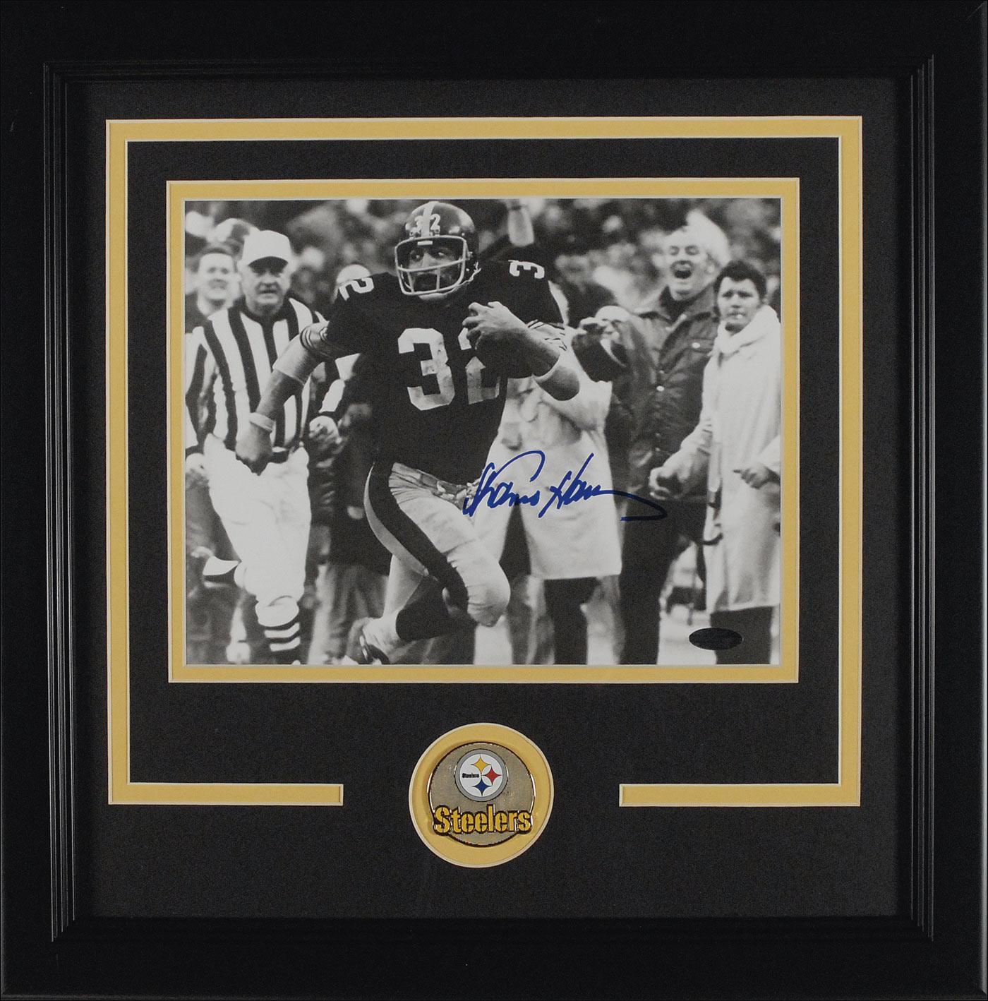 Glossy 10 x 8 photo of Harris returning the ‘Immaculate Reception,’ signed in blue felt tip. Double matted and framed with a Steelers pin, to an overall size of 16.25 x 16.25. In very fine condition, with a Steiner hologram affixed to lower right corner.