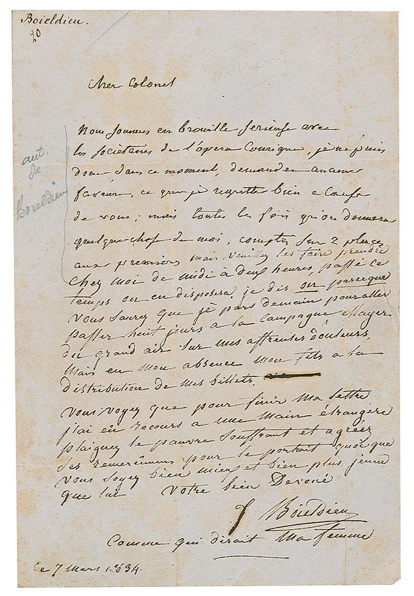 ALS in French, signed “F. Boieldieu,” one page, 5.5 x 8, March 7, 1834. Letter to a Colonel Marnier, informing him that he is in conflict with the Opera Comique and thus is not in a position to request any favors. However, he says that he will be glad to have two seats reserved at the Opera on occasions on which his own works are being performed. He apologizes for his wife having to write part of the letter due to pain in his right hand. In very good to fine condition, with light staining and creasing.