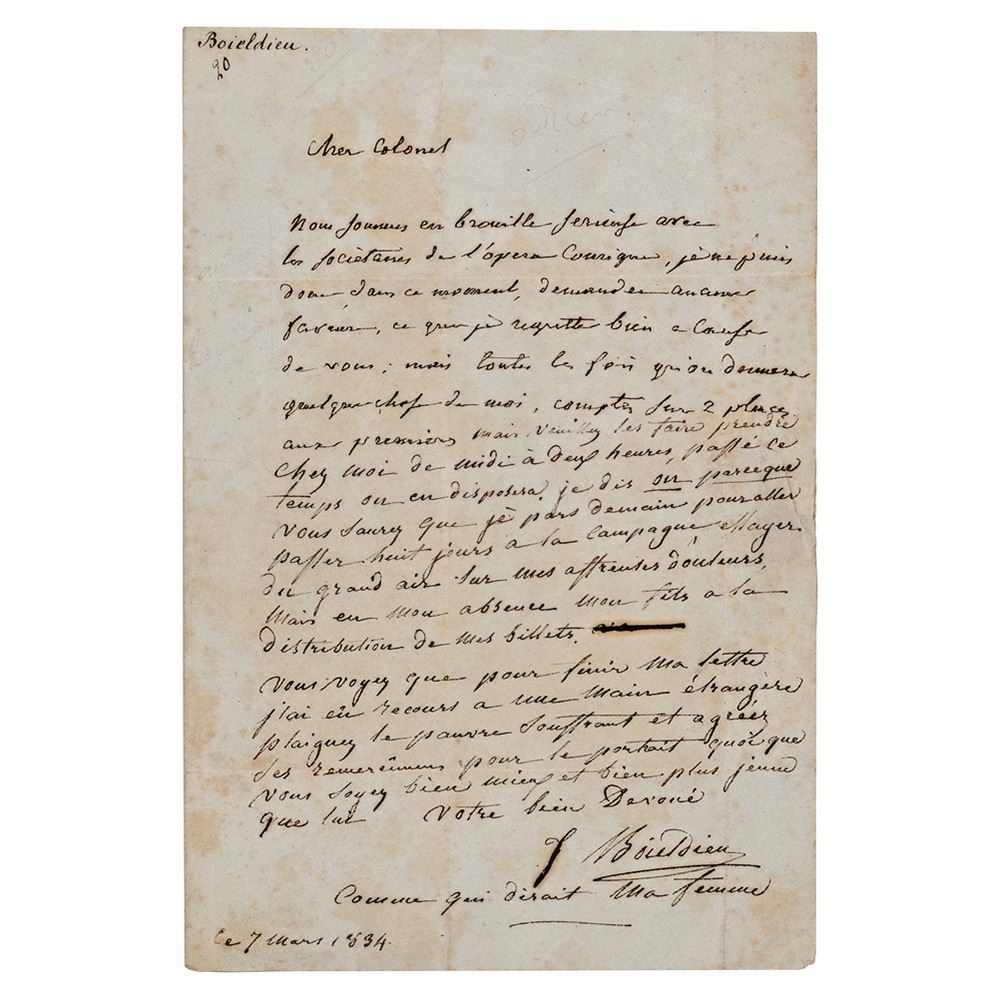 ALS in French, signed “F. Boieldieu,†one page, 5.5 x 8, March 7, 1834. Letter to a Colonel Marnier, informing him that he is in conflict with the Opera Comique and thus is not in a position to request any favors. However, he says that he will be glad to have two seats reserved at the Opera on occasions on which his own works are being performed. He apologizes for his wife having to write part of the letter due to pain in his right hand. In very good to fine condition, with light staining and creasing.