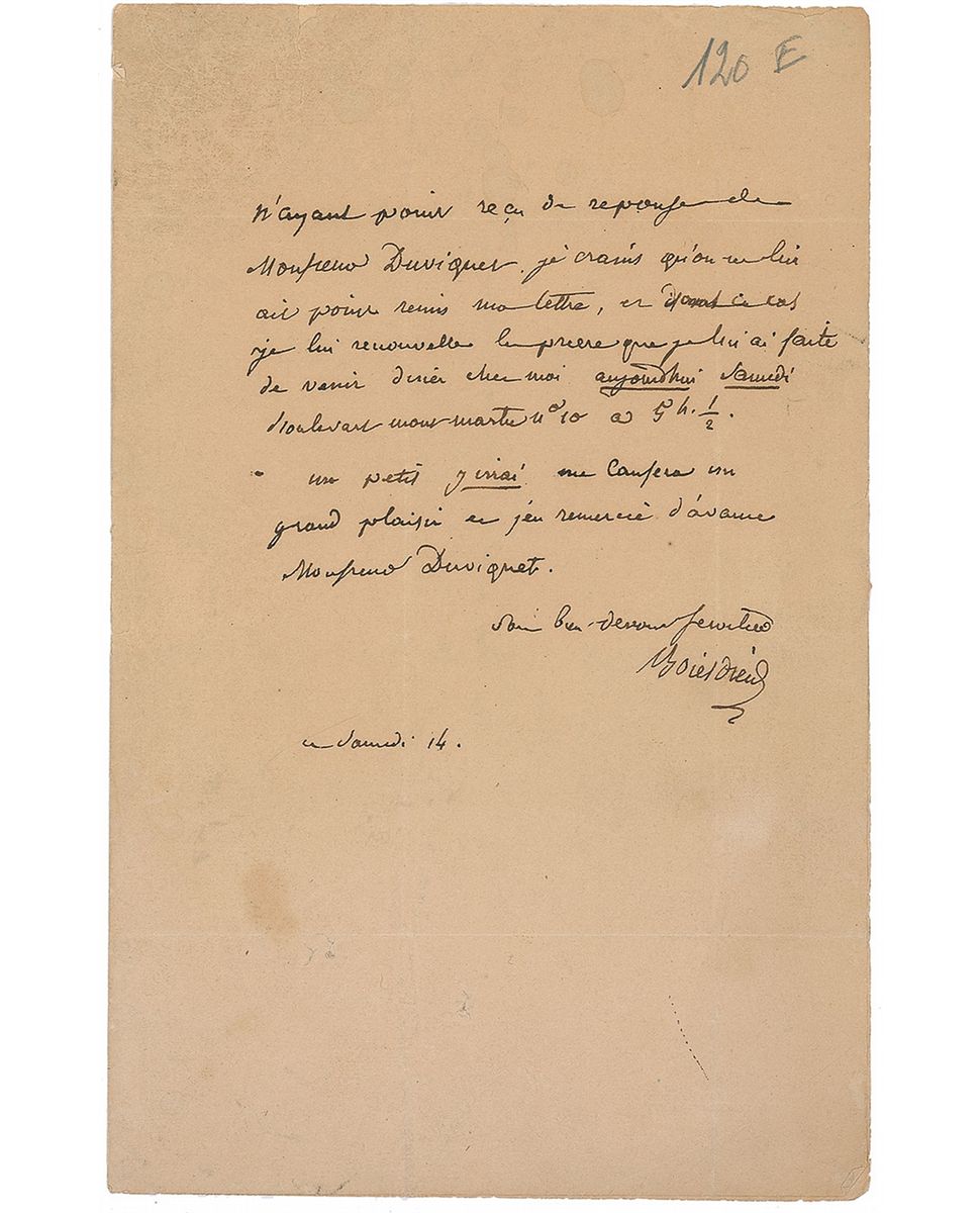 French opera composer often called ‘the French Mozart’ (1775–1834). Untranslated ALS in French, signed “Boieldieu,” one page, 5 x 8, no date. In very good condition, with intersecting folds (one vertical fold passing through a single letter of the signature), scattered soiling, small edge chips and tears, and a pencil notation to upper right.