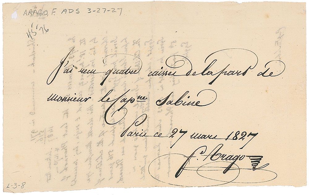 French Catalan mathematician, physicist, astronomer, and politician (1786-1853). ANS in French, signed “F. Arago,” one page, 7 x 4.25, March 27, 1827. Untranslated note boldly signed at the conclusion by Arago. Central vertical fold, several pencil notations to top, and show-through from unrelated notations on reverse, otherwise fine condition.