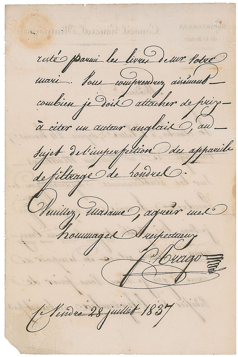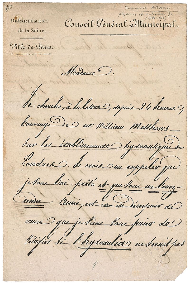 French Catalan mathematician, physicist, astronomer, and politician (1786-1853). ALS in French, signed “F. Arago,” one page both sides, 5.5 x 8, Conseil General Municipal letterhead, July 28, 1837. Letter to an unidentified woman. In part (translated): “I have been looking, literally, for the last 24 hours, for the volume by Mr. William Matthews on the hydraulic establishments of London…So it is only as a last resort that I am troubling you, to ask you to check whether the ‘Hydraulia’ could possibly have remained among your husband’s books. You will easily understand how important it is to me not to be able to quote an English author on the subject of the imperfections of the filtering systems used in London.” Reverse on integral second page bears an address panel in Arago’s hand. Intersecting folds, scattered light toning and soiling, small punch hole to top left, and missing lower right corner tip, otherwise fine condition.