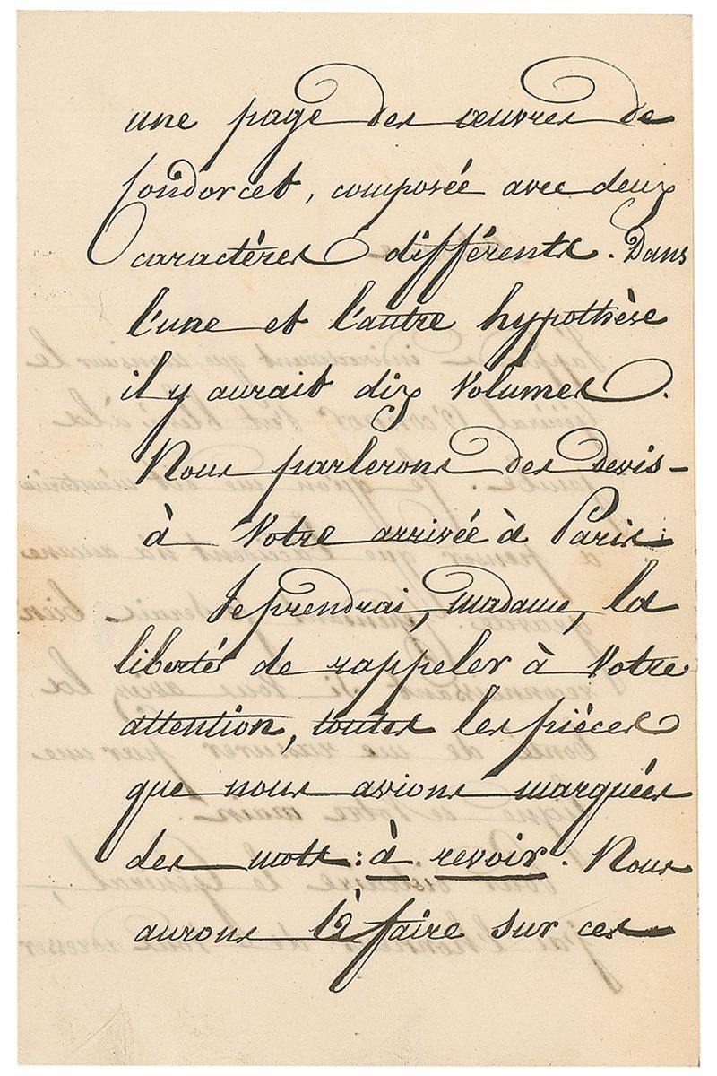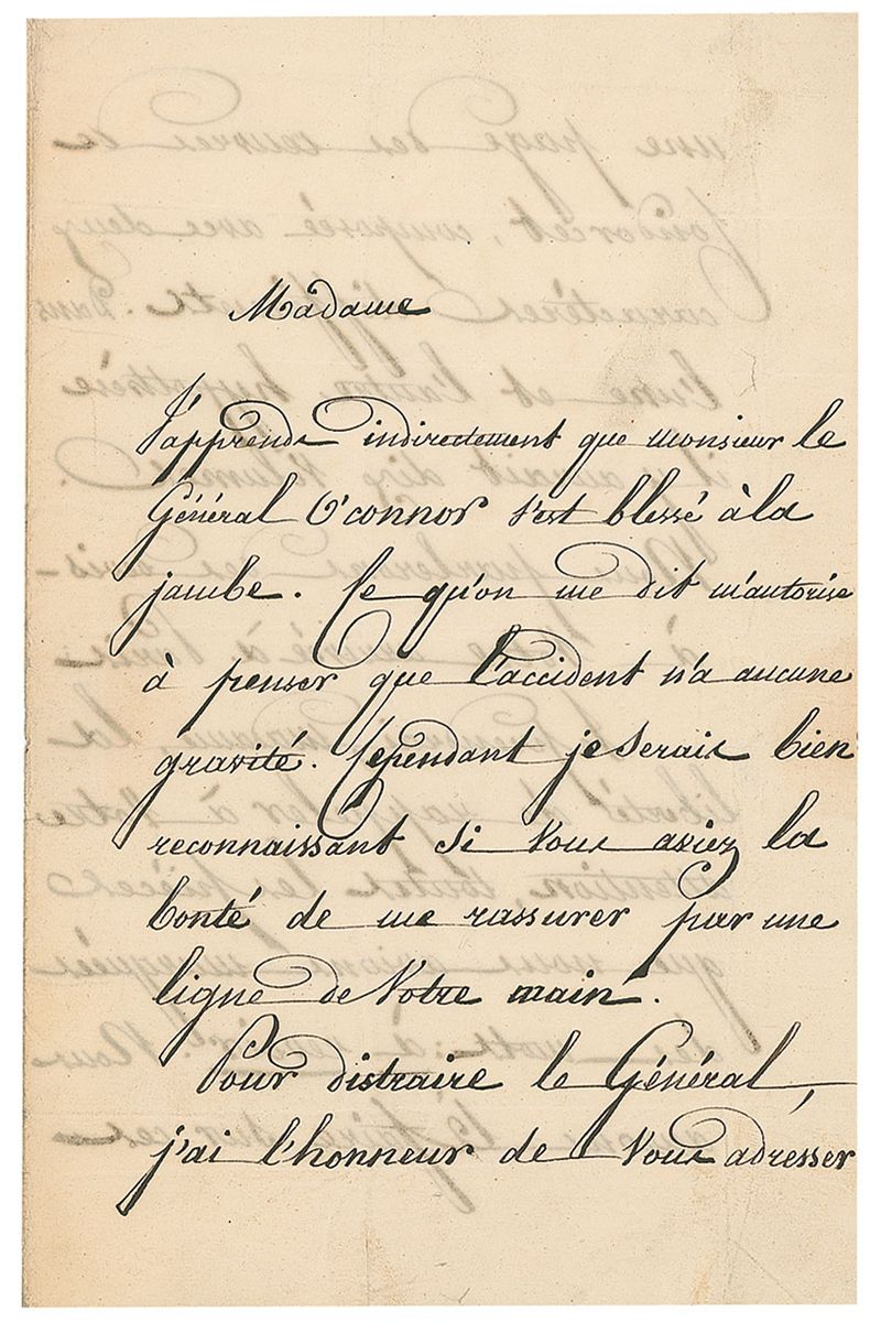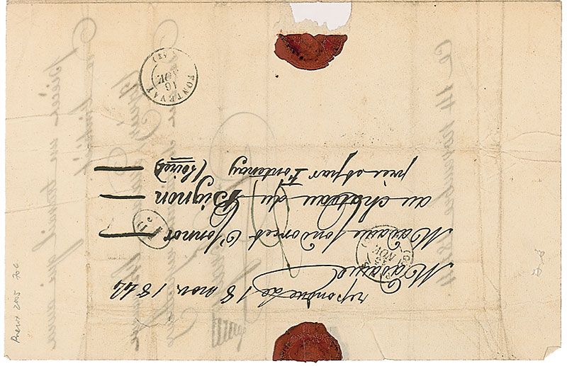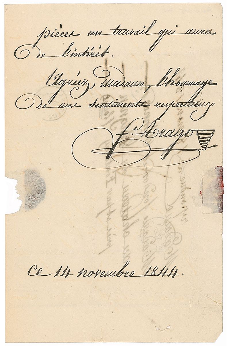 French Catalan mathematician, physicist, astronomer, and politician (1786-1853). ALS in French, signed “F. Arago,” three pages on two adjoining sheets, 5 x 8, November 14, 1844. Untranslated letter to Madame O’Connor. Reverse of second integral page bears an address panel in Arago’s hand, as well as red wax seal remnants. Intersecting folds, small area of paper loss along hinge, and show-through from writing on opposite side, otherwise fine condition.