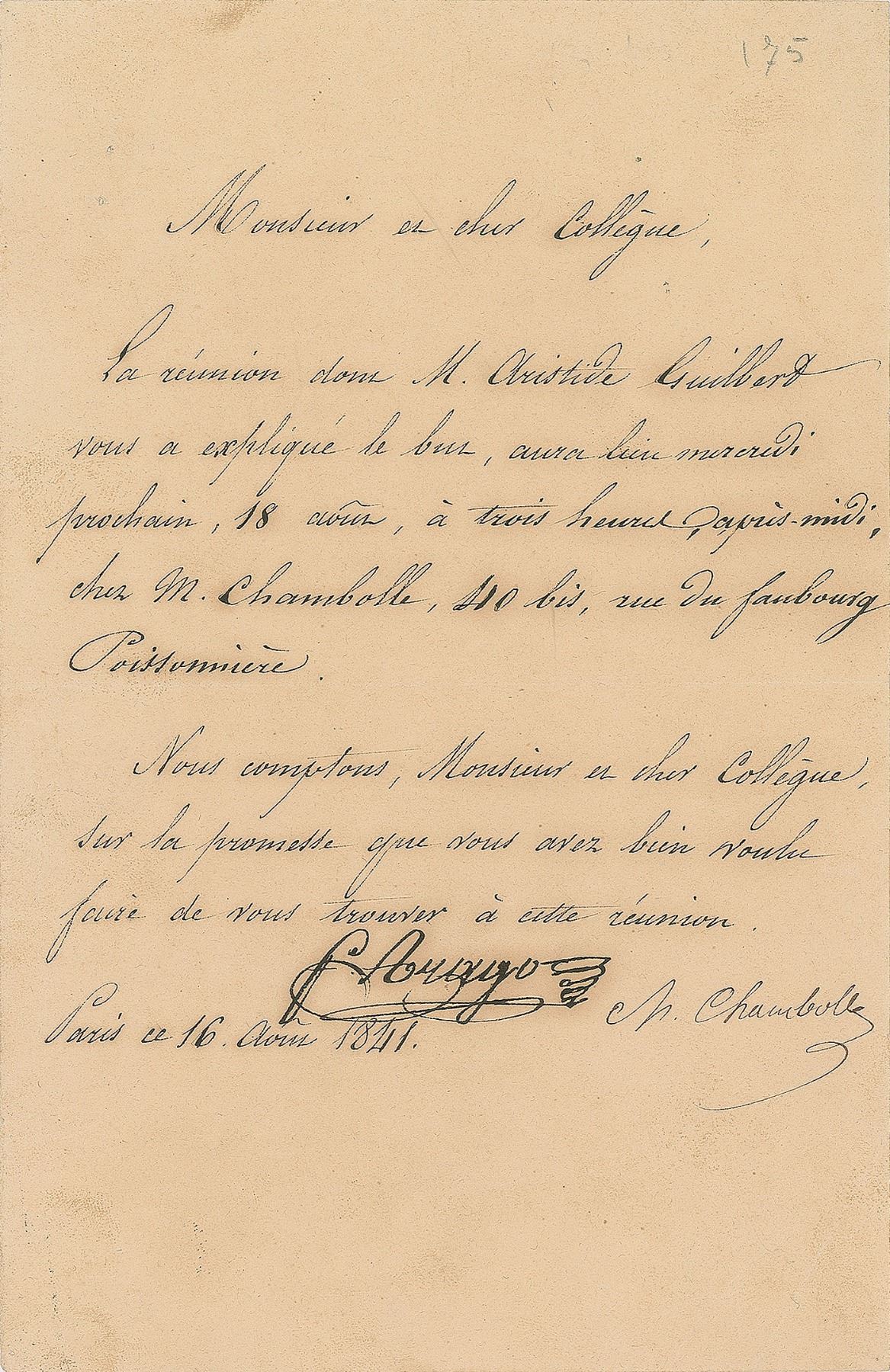 French Catalan mathematician, physicist, astronomer, and politician (1786-1853). LS in French, signed “F. Arago,” one page, 5.25 x 8.25, April 16, 1841. An untranslated letter to a colleague. In fine condition.