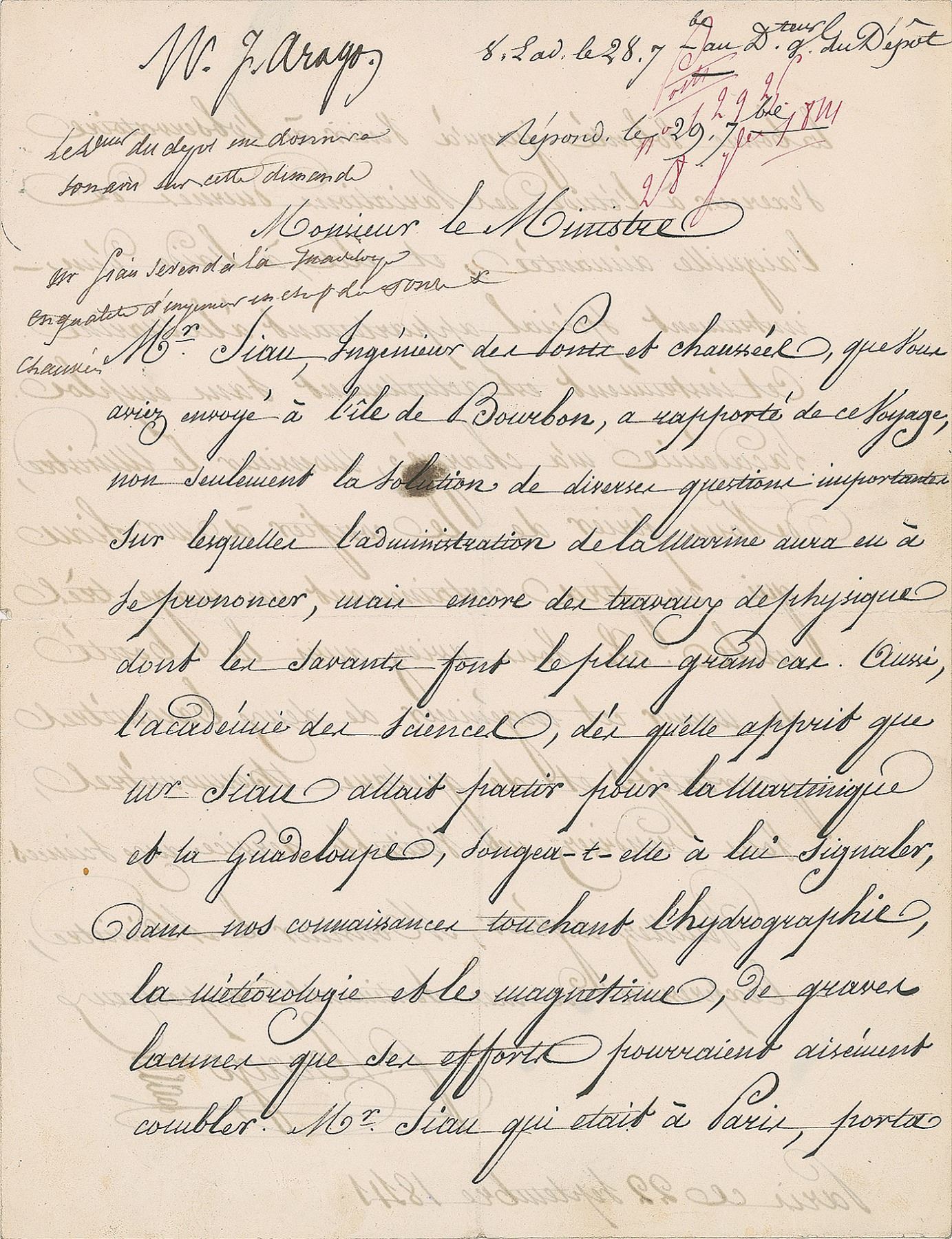 French Catalan mathematician, physicist, astronomer, and politician (1786–1853). Untranslated ALS in French, signed “F. Arago,” one page both sides, 8 x 10.5, September 22, 1841. In fine condition.