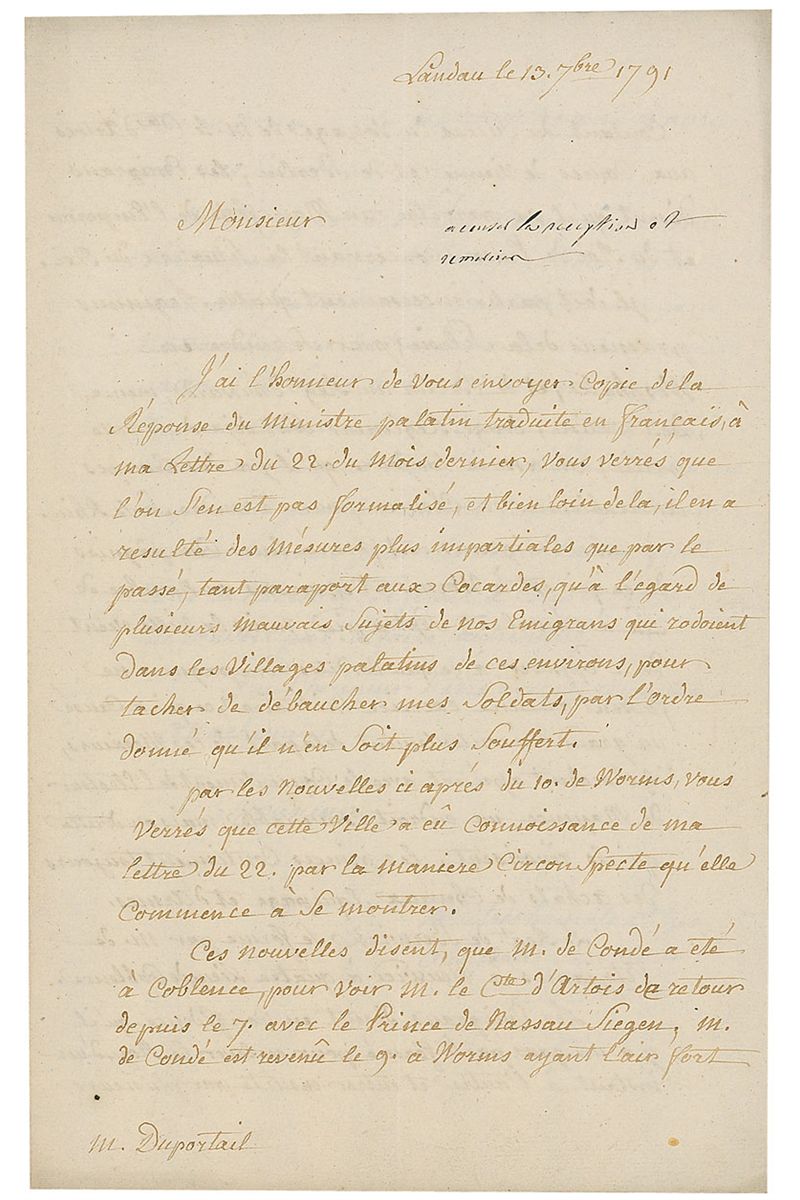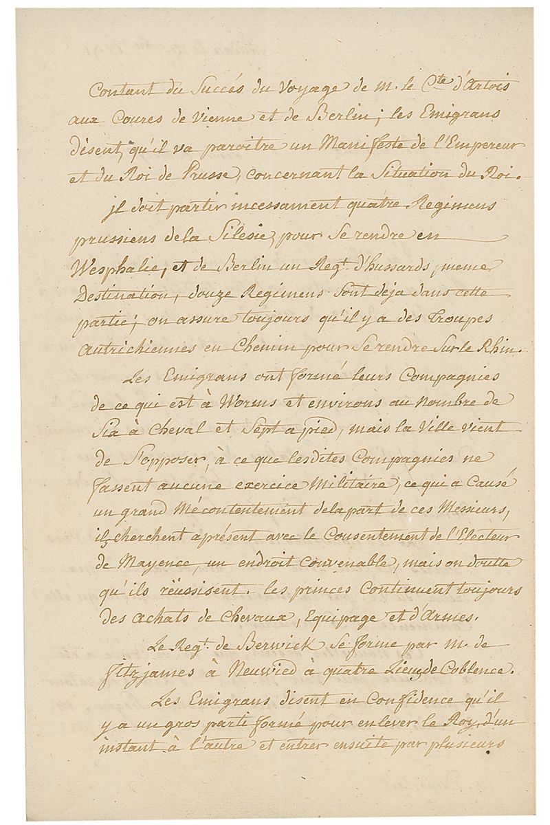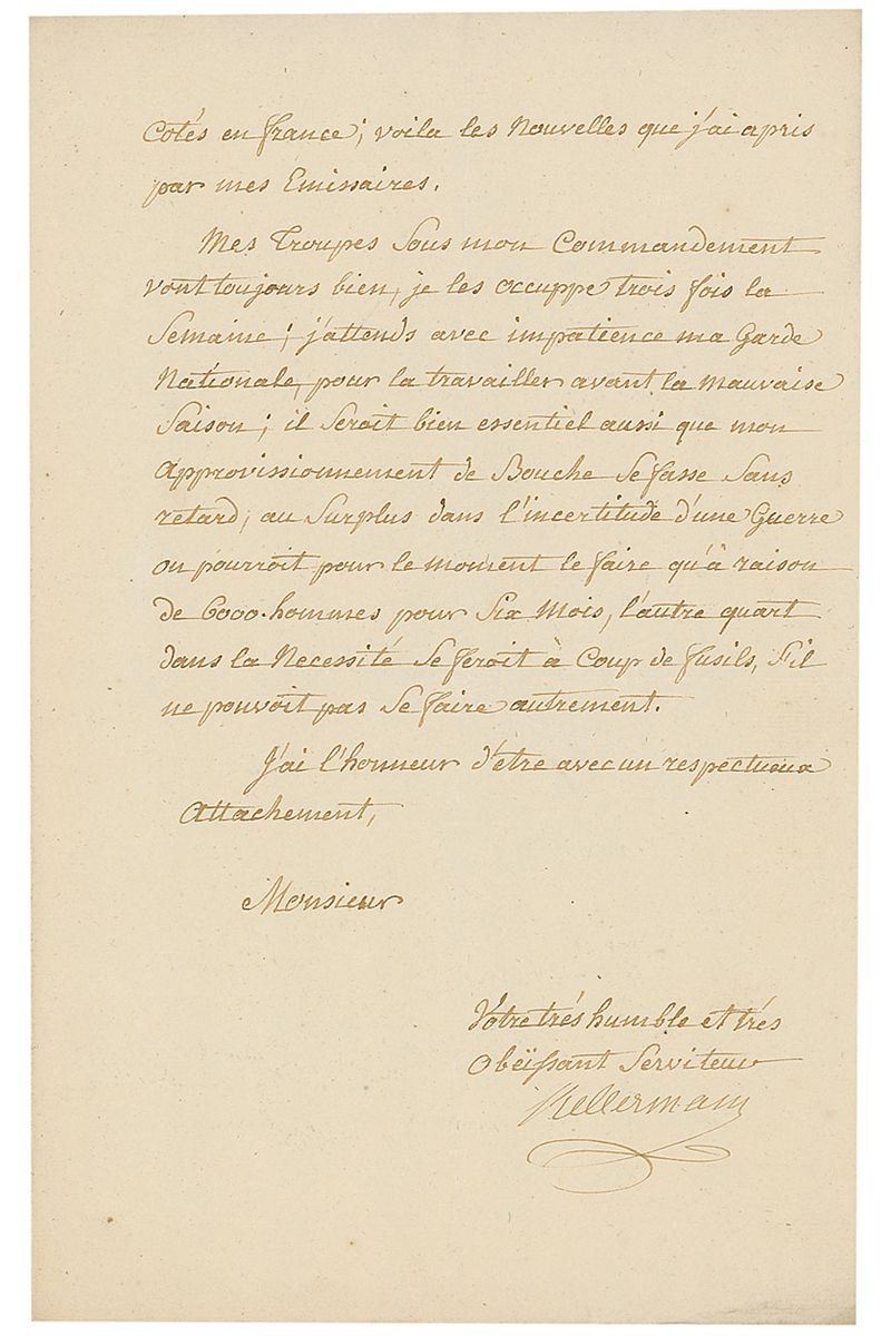 French military commander, later the Général d'Armée, and a Marshal of France (1735–1820). Compelling LS in French, signed “Kellermann,” three pages on two adjoining sheets, 7.75 x 12.25, September 13, 1791. Letter to General Duportail, Minister of War, regarding the activities and plans of the Emigre Army, then allied with the Prussians and Austrians. Kellermann writes of the measures he has taken against insults to the tricolor cockade and "evil subjects of the Emigres who are roving through the Palatine villages attempting to taint and debauch my soldiers.” In part (translated): “By the news received here since the 10th, from Worms, you are to understand that this town is obeying the tenor of my letter of the 22nd, last month, owing to the circumspect manners they have begun to exhibit…Reports go on to say that M. de Conde [leader of the Emigres] has been to Coblentz to see M. le Comte D’Artois, [later Charles X of France] and he returned on the fifth to Worms, with the Prince of Nassau. Gonde arrived at Worms having fully learned of the outcome of the journey of Artois to the courts of Vienna and Berlin. The Emigres say that he has presented a report to the Emperor [of Austria] and the King [of Prussia] concerning the situation of the King [Louis XVl.]…Four Regiments of Prussians have left from Silesia to go to Westphalia and a regt. of Hussars from Berlin for the same destination. Twelve regts. more are also on the road to the Rhine and I am assured that Austrian troops are also on the road to the Rhine. The Emigres are forming companies at Worms and its envisions to the number of 6 of horse and 7 of foot. The Regt. of Berwick is commanded by M. de Fitzgerald, at Meuwiel, four leagues from Coblentz.” In fine condition, with central horizontal and vertical folds and a mild shade of toning. Exiled noblemen hoped to invade France, overthrow the Revolution and rescue King Louis XVI. In 1792, at the Battle of Valmy, Kellermann decisively defeated the invaders and saved France. He was later created Duke of Valmy by Napoleon in honor of this event.