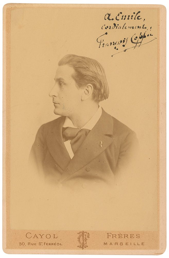French poet and novelist (1842–1908) who was known as ‘the poet of the humble.’ Original 4.25 x 6.5 cabinet photo by Cayol Freres of Marseille, signed and inscribed in the upper right in black ink “A Emile, cordialement, Francois Coppee.” In fine condition, with some irregular adhesion to the inscription and signature.