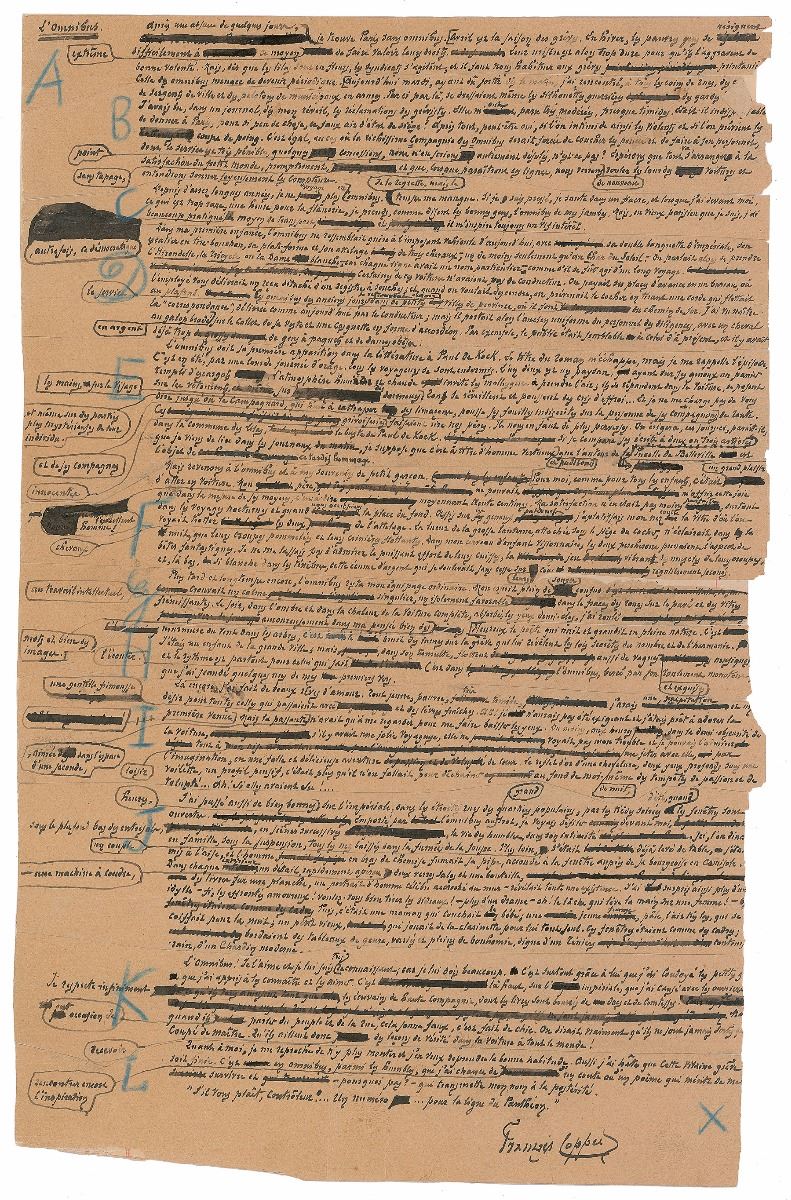 French poet and novelist (1842–1908) who was known as ‘the poet of the humble.’ Lengthy AMS in French, one page, 8.5 x 13.5, no date. Untranslated essay entitled ‘L’Omnibus,’ inspired by a transportation strike in Paris, recollecting his earlier years casually riding around in horse-drawn carriages and observing the everyday life of the city. Previously cut into several strips (labeled alphabetically) and now remounted on a backing sheet. In very good condition, with chipping to edges affecting some portions of the text, uniform toning, and aforementioned reconstruction of fragments.