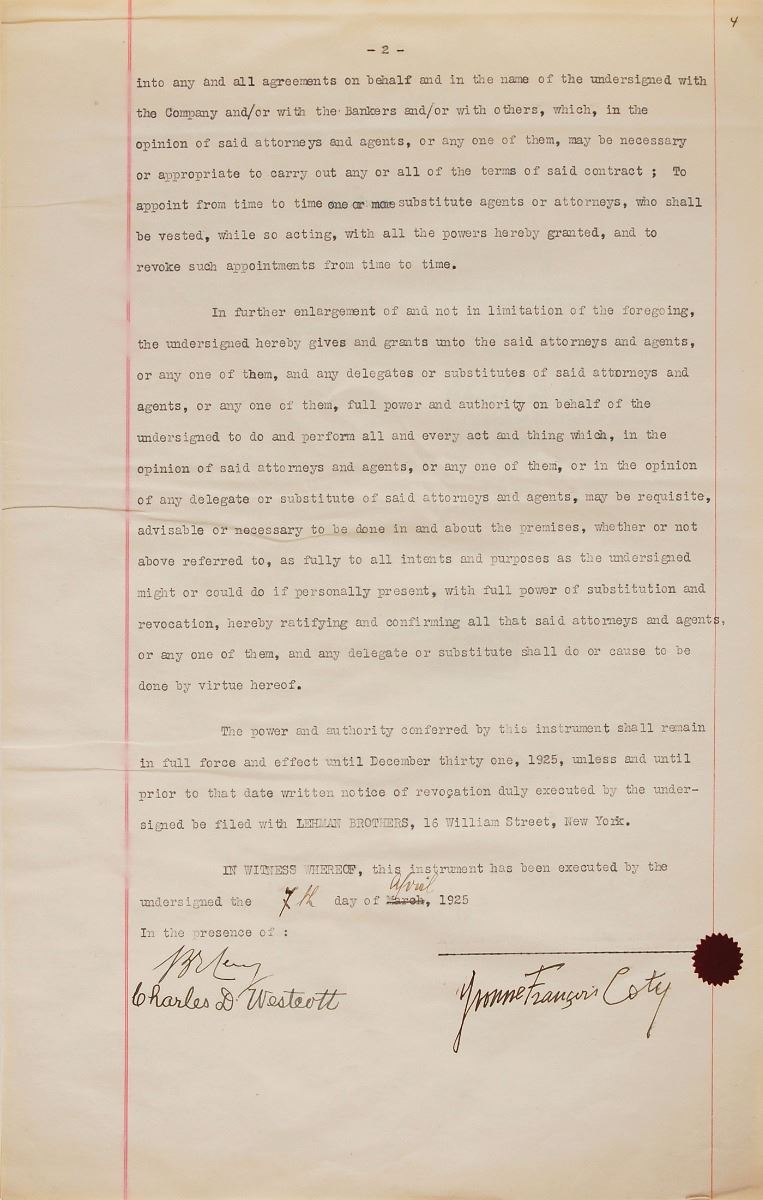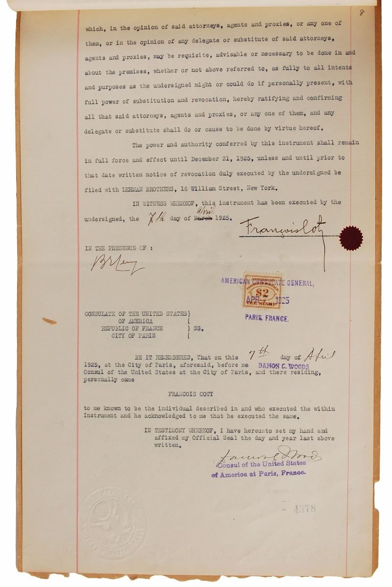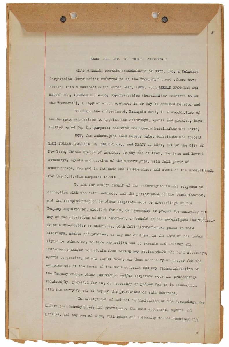 French perfumer and businessman (1874–1934) who founded the beauty product manufacturer Coty, Inc., in 1904. DS, three pages, 8.5 x 14, April 7, 1925. Power of attorney document in which Coty appoints Paul Fuller, Frederic R. Coudert, Jr., and Percy A. Shay to act on his behalf as a stockholder of Coty, Inc. Also includes a similar document of the same date signed by his then-wife, Yvonne Francois Coty. In overall fine condition. Yvonne divorced Coty in 1929 and was awarded the company as part of the settlement; in 1963, she sold Coty, Inc., to Pfizer.