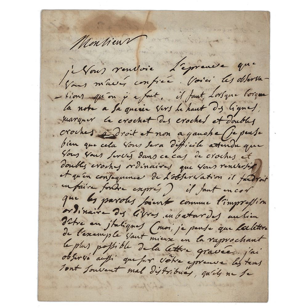 French composer of operas, string quartets, symphonies, and choral works (1734–1829). Rare ALS in French, signed “Gossec,” three pages, 6.5 x 8.25, May 12, 1784. Handwritten letter to a publisher, in full (translated): “I am returning the proof with which you have entrusted me. Here are the remarks which arise from it. When a note has its stem pointing upward, the tail of eighth notes and sixteenths must be set to the right and not to the left (I think you will find this difficult seeing that in this case you have used ordinary eighths and sixteenths upside down) and as a result of this you will need to cast special type. Also the words must be printed as normally done in books, in bastard-type, not italic (I think the example is better when it is near as possible to the engraved letter). I have also noticed in your proof that the beats are often poorly laid out and not distinct enough, that’s to say there must always be a wider gap between one note and another that consists of lesser note-value. I am aware that the words often lay down the law in such instances, but the words must be made to fit the notes and not the notes to fit the words. To get this just right the setter must be a musician (there’s the rub). It has also been quite correctly observed that your lines are too curly and much less straight and neat than all the examples we have seen and which you showed us in various books. It is essential to get this right; it is the most serious fault in printed music. If in the ariette which I have had the honor to send you you can get rid of all the faults I have listed, all will be well. I would beg you, Sir, to be kind enough to send this as promptly as possible. This is necessary in order to appease the impatience of the minister and of M. De la Ferte who ask for news of this every day and urge us most pressingly.” In very good to fine condition, with slightly irregular toning, and a stain to the top edge.