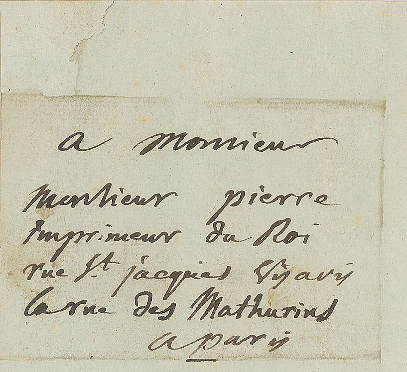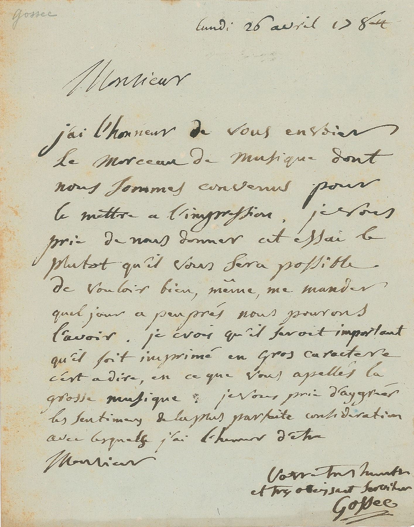 French composer of operas, string quartets, symphonies, and choral works (1734–1829). ALS in French, signed “Gossec,” one page, 6.5 x 8.25, April 26, 1784. Untranslated letter addressed to the king's official printer in Paris. In very good to fine condition, with light staining along the left edge, and a thin strip of toning along the bottom edge.