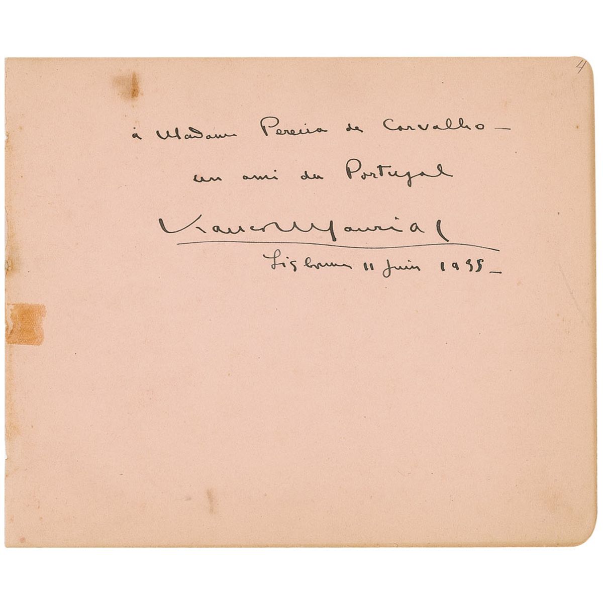 French author (1885-1970) and winner of the 1952 Nobel Prize in Literature. Vintage fountain pen signature and inscription, “a Madame Pereina de Carvallo—un ami du Portugal, Francois Mauriac, Lisbon 11 Juin 1935,” on a light pink 7 x 6 album page. In fine condition, with toning to edges, with a couple heavier small blocks, and a small ink notation to top right.
