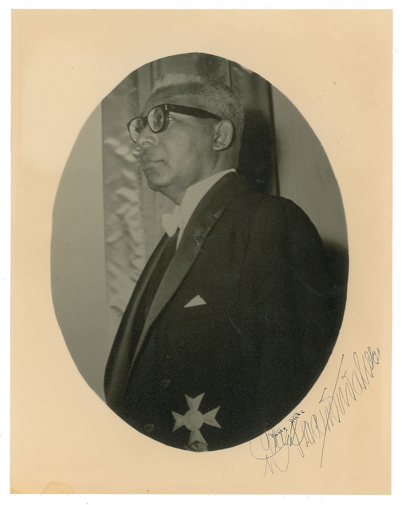 Vintage matte-finish 7.5 x 9.5 photo of the Haitian despot, signed in the lower border in fountain pen. In very good to fine condition, with light rippling and a small stain to the lower left corner, and a small tear in the center of the photo on Duvalier's lapel.