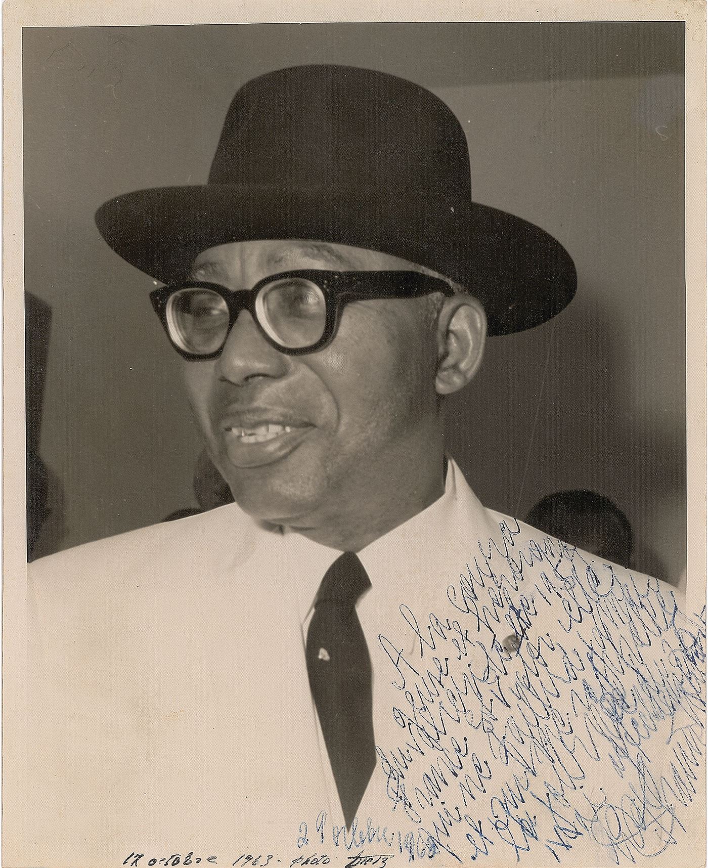 President of Haiti (born 1907) from 1957 until his death in 1971, whose rule, based on a purged military and the use of a pervasive cult of personality, resulted in the murder of 30,000 to 60,000 Haitians and the exile of many more. Vintage matte-finish 8 x 10 photo of Papa Doc wearing a hat and white suit, signed in black ink and adding a lengthy inscription in French. In fine condition, with a few light surface creases. Highly rare in signed pictures, this originates from the estate of Duvalier's secretary Francesca Saint Victor.