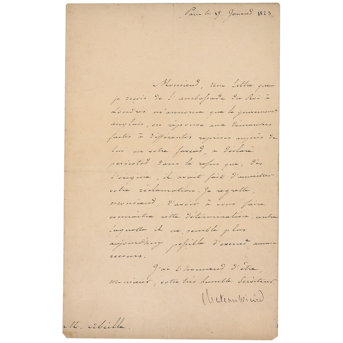 Writer, politician, diplomat, and historian (1768–1848). He is considered the founder of Romanticism in French literature. LS in French, signed “Chateaubriand,” one page, 8 x 12.5, January 19, 1823. Untranslated letter to Monsieur Obeille. Central horizontal and vertical fold, and scattered light toning and soiling, otherwise fine condition.