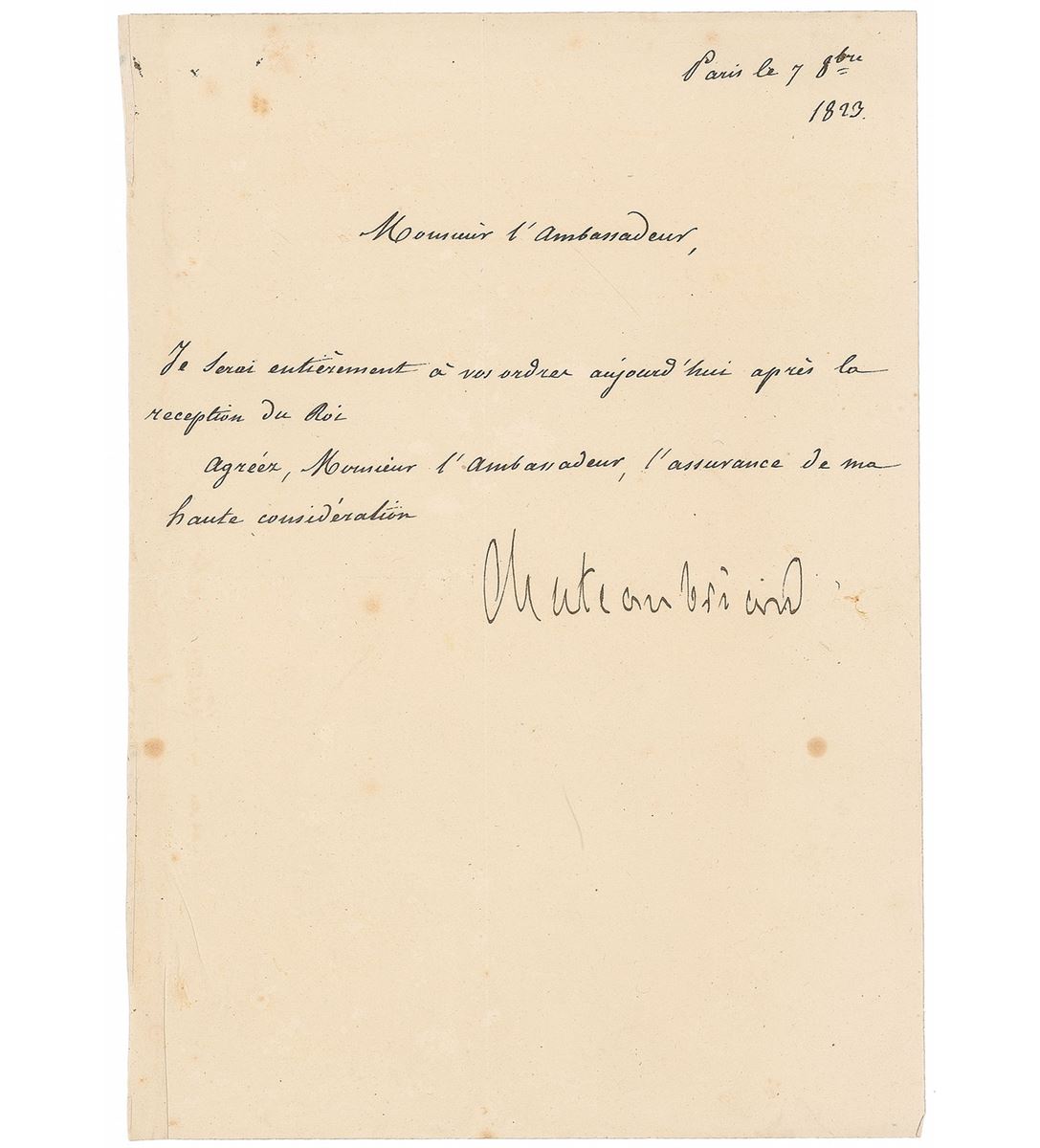 Writer, politician, diplomat, and historian (1768–1848) considered the founder of Romanticism in French literature. LS as foreign minister in French, signed “Chateaubriand,” 6.5 x 9.25, October 7, 1823. Letter to the Russian Ambassador Pozzo di Borgo, in full (translated): “I will be entirely at your disposal today, after the reception given by the King. Please accept, Your Excellency, the assurance of my high esteem.” Central vertical and horizontal folds (passing through portions of the signature), scattered spots of soiling, and creasing to left edge, otherwise fine condition. Di Borgo served as a Russian diplomat in Paris for fourteen years, and later on was critical in preventing difficulties with Russia during the revolution of 1830.