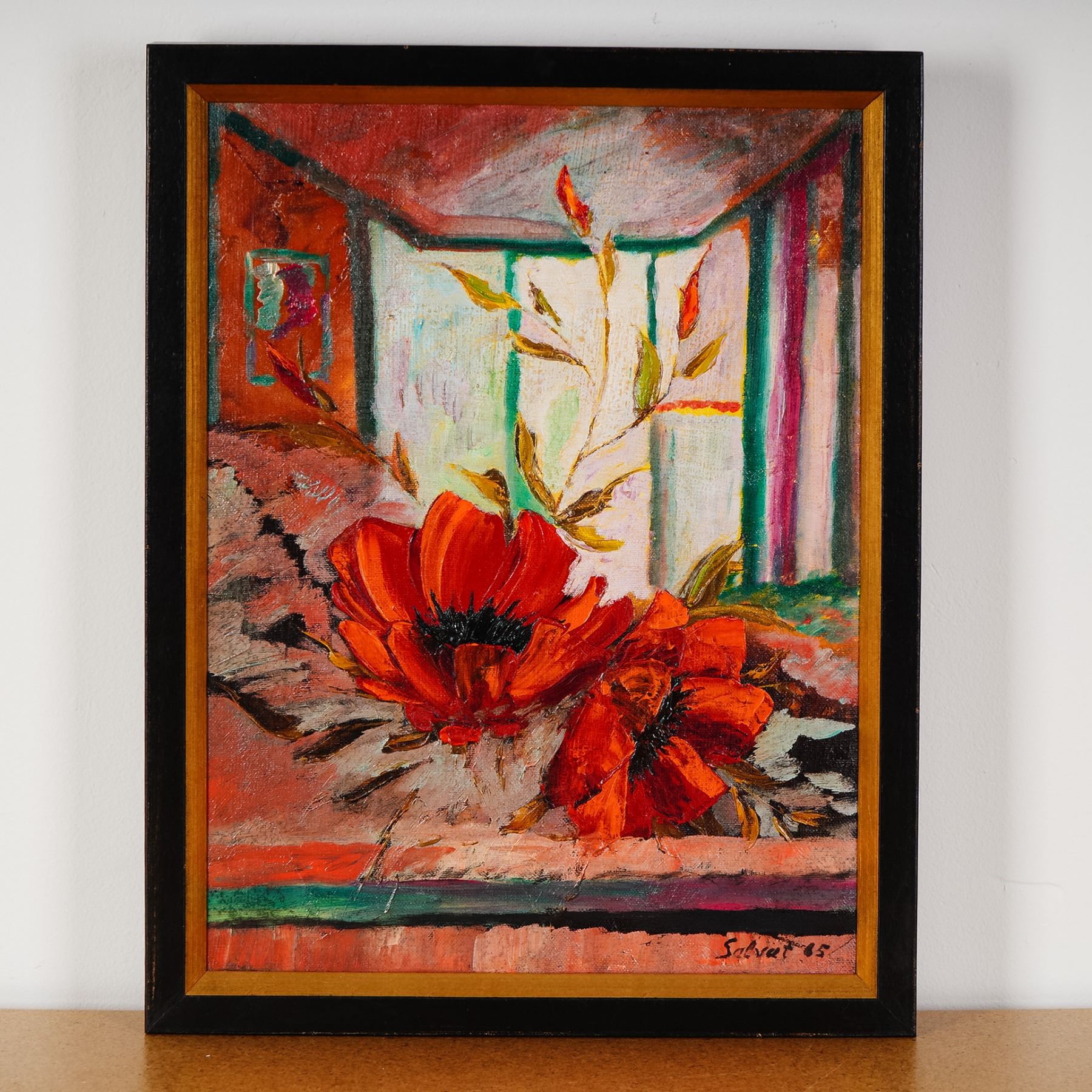 A vibrant oil on canvas by French painter Francois Salvat. This bold composition features a striking display of poppies, painted in deep crimson and scarlet tones against an abstracted interior backdrop. Salvat's brushwork blends expression and structure, creating an atmosphere that feels both intimate and dramatic. Known for his colorful and modernist approach, Francois Salvat was active in France throughout the 20th century, producing works that often emphasized the emotive qualities of color and form. This piece captures the strength of his vision and offers a stunning example of mid-century French painting. Signed and dated 65 lower right