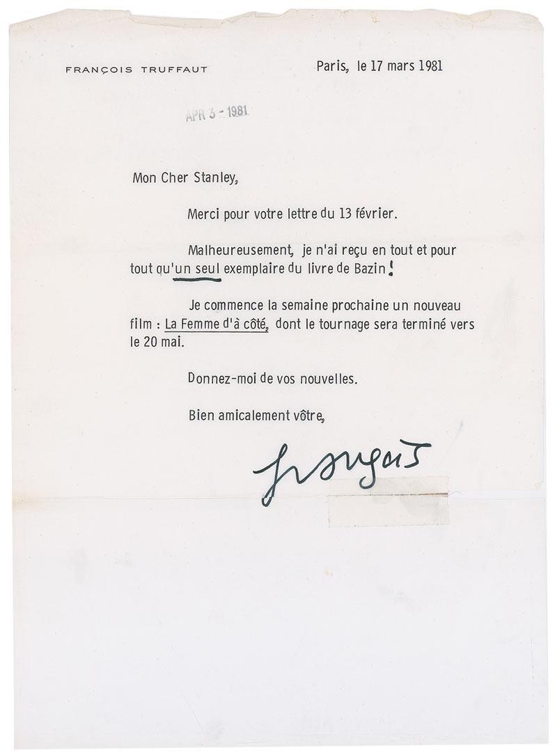 TLS in French, one page, 8.25 x 11.25, personal letterhead, March 17, 1981. Letter to Stanley Hochman. In part (translated): “…sadly, I received only one copy of Bazin's book. Next week I am beginning work on a new film, The Woman Next Door.” In very good condition, with tape repair to separation along horizontal fold under signature, office stamp near top, and scattered creases and small edge tears to horizontal edges. Accompanied by the original mailing envelope.