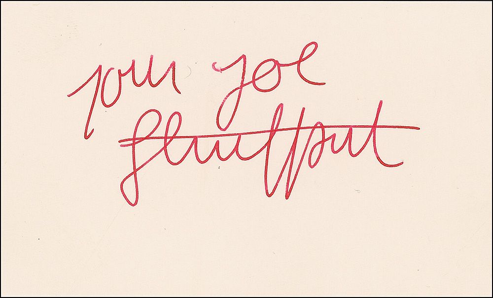 In-person ink signature and inscription, “Pour Joe, Francois Truffaut,” on an off-white 5 x 3 card. In very fine condition.