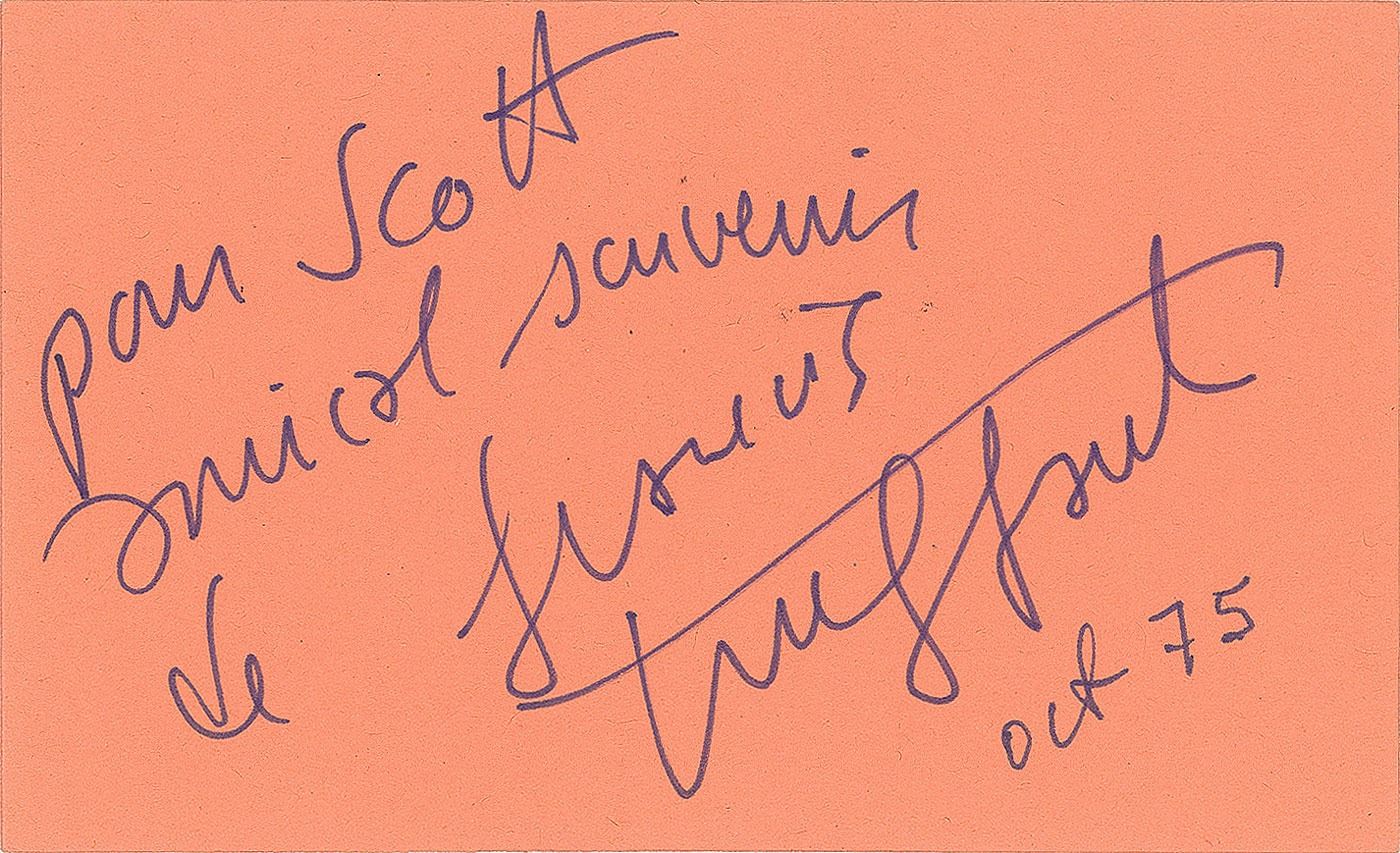 Felt tip signature and inscription, "Pour Scott, Amical souvenir de Francois Truffaut, Oct 75,” on a light orange 5 x 3 card. In fine condition. Accompanied by an unsigned glossy photo of the French filmmaker. From the Harvey and Rhoda Kuflik Collection.