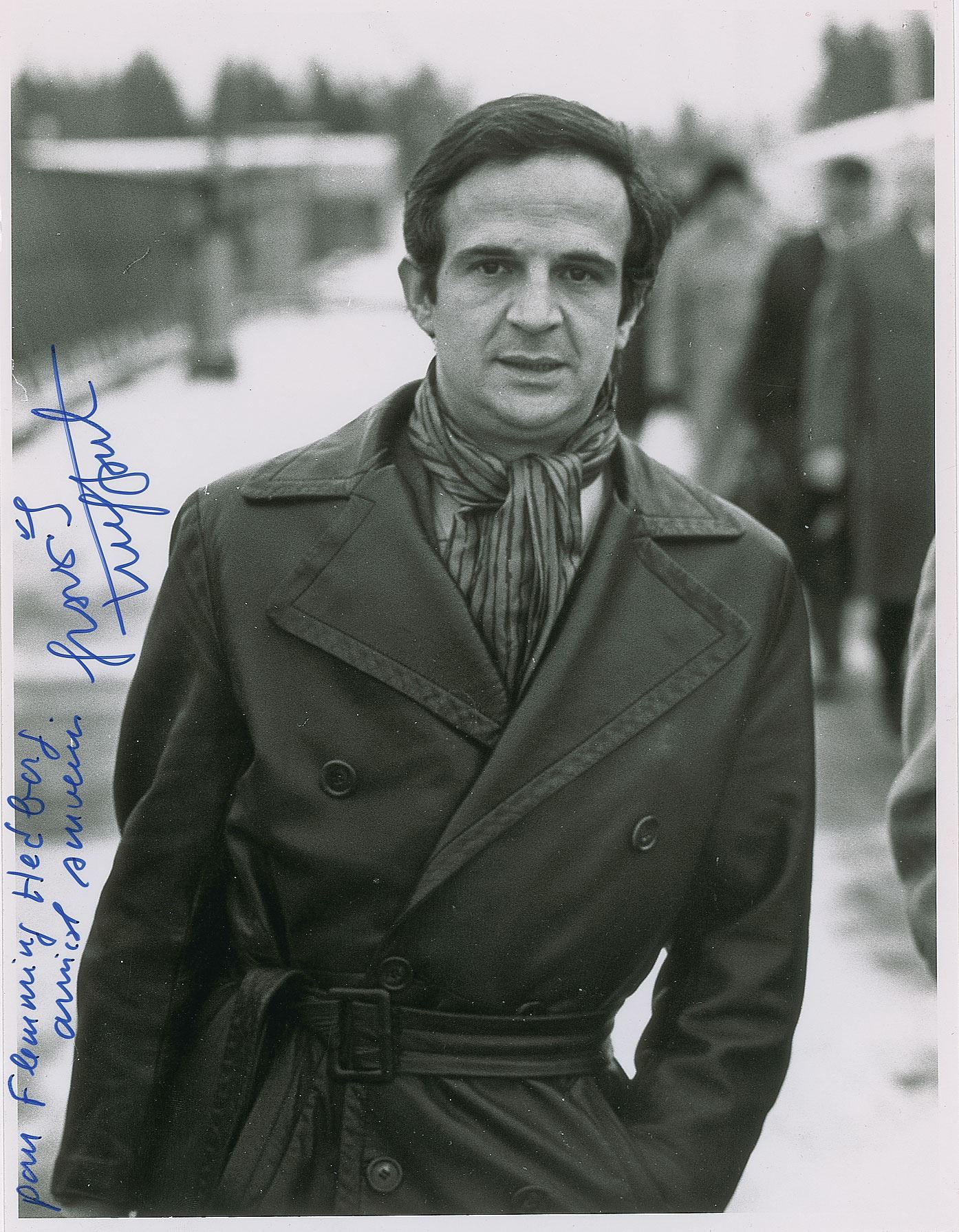 Glossy 7.75 x 10 photo of the French New Wave director in an overcoat, vertically signed and inscribed in blue felt tip, "Pour Flemming Hedborg, amical souvenir, Francois Truffaut.” In fine condition, with a few small creases, and a circular postal impression at the top edge.