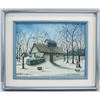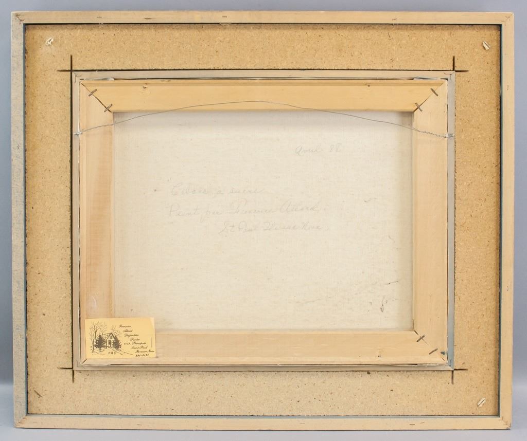 Acrylic on canvas, framed. Featuring a child collecting sap from a tree in the winter. Signed "Francoise Allard" to the bottom right corner. Label on verso reads "Fancoise Allard Desjardins Peintre 1073, Principale Saint-Paul He-aux-naix". "Anril 88 / Cabana a sucre / Print far Buneorie Allard / St. Paul [...]. Attributed to Francoise Allard (Canadian, b.1949). Canvas size: 34 x 44.5 cm (13.5 x 17.5 inches). Frame size: 52 x 62 cm (20.3 x 24.3 inches).