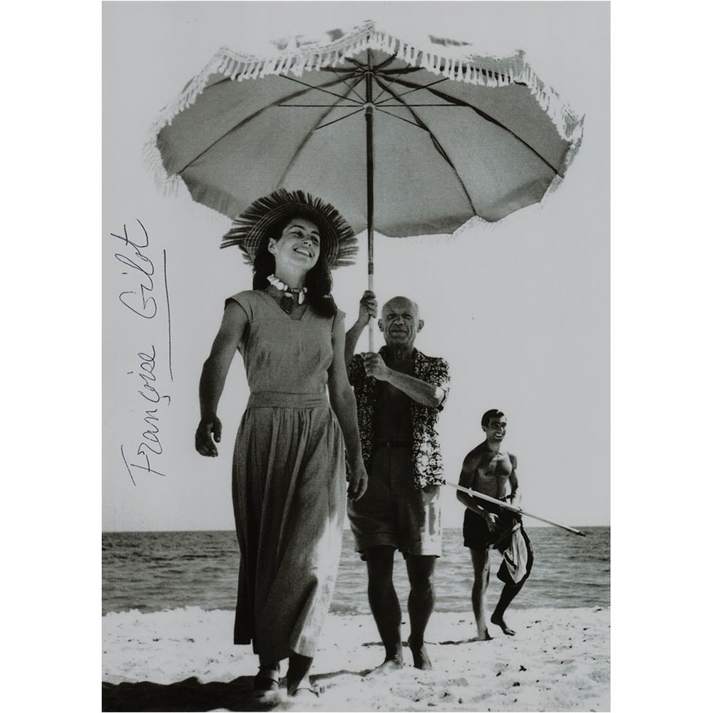Glossy 8 x 11.25 photo of Gilot on the beach with Pablo Picasso—one of the most iconic images of the 20th century—signed in black ballpoint, "Francoise Gilot." In fine condition.