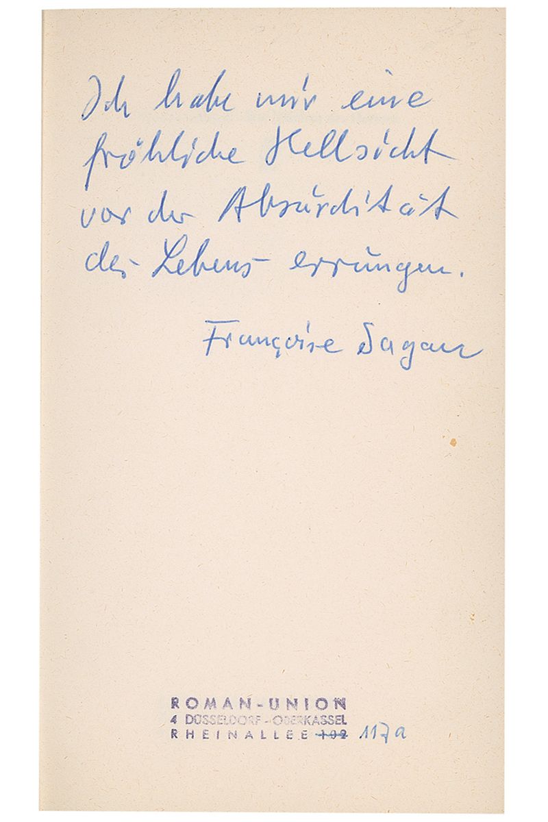 Important French writer (1935–2004) who attained international prominence with the publication of her first novel, Bonjour Tristesse, at the age of 18. Signed book: Der Wachter des Herzens (The Heart-Keeper). Later printing. Berlin: Ullstein, 1969. Hardcover, 5 x 8.5, 148 pages. Signed and inscribed, in German, on the second free end page. In fine condition, with owner’s stamp to first two pages and light wear to boards.