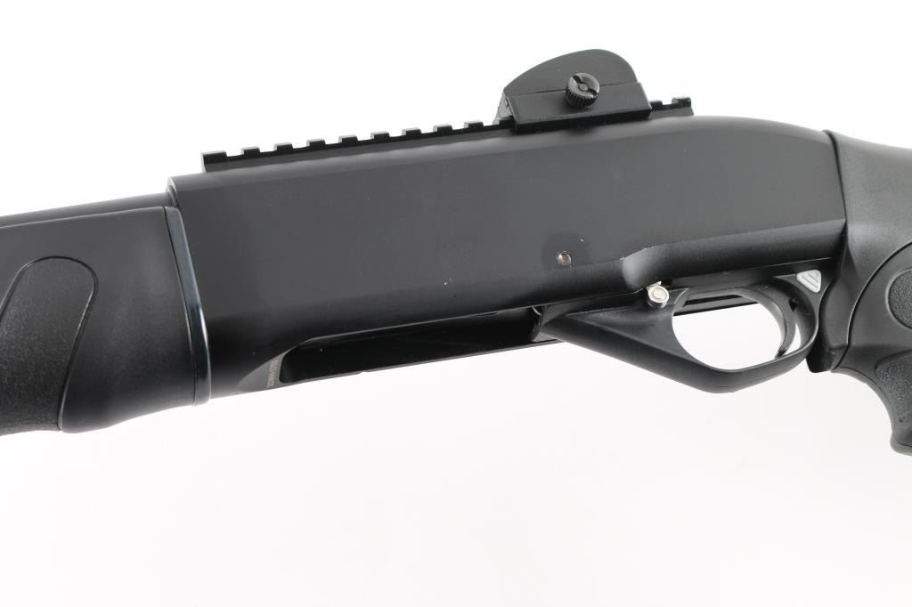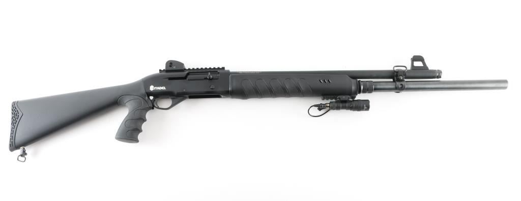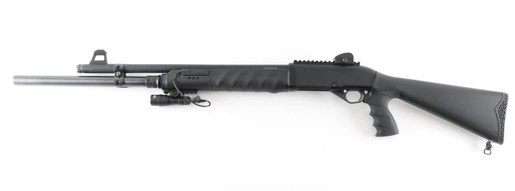 Sn: 21wh-1753 Made in Turkey for Legacy Sports in Reno, NV. this is a semi-auto shotgun chambered for 3" 12 gauge shells. It has a 20" chrome lined, black matte finish barrel and receiver to match. The barrel uses extended chokes and comes with one choke marked CYL. It sports a raised tactical fiber optic front sight and an adjustable rear peep sight mounted on a picatinney rail. It has a smooth trigger and a manual safety behind the synthetic trigger guard. It sits in a very nice black synthetic stock and forend. The forend has textured grooves for better hold and an integral accessory rail with a KE 1A pressure pad flashlight, pad attached to left side, (flashlight works). Butt stock has sling ring attached, a ventilated rubber recoil pad and rubberized finger groove pistol grip. It also has a 14" extended magazine tube or 27" overall mag tube. (don't take it bird hunting!) The extended tube is screwed on and also attached to the barrel with a barrel clamp that has a sling ring attached. Metal finish looks very good with minor signs of handling, a couple of scuffs on top of the barrel, to be expected with this type finish. Synthetic stocks look very good. Bore looks good, needs cleaned. LOP is 14.5". Condition is NRA Excellent *Modern Firearm*