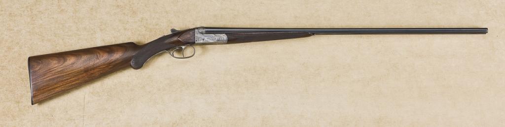 Francotte 410ga double-barrel boxlock shotgun model 11 prewar, serial number “83277”. The gun shows 26-1/8” barrels, auto ejectors, scroll engraved frame, checkered pistol grip stock, with horn buttplate. The gun weighs only 4.15lbs. And remains in very good plus to near fine condition with 90-95% original blue on barrels, some slight erosion and pitting just starting towards the forward of the muzzles on the left barrel, but generally crisp overall with approx. 70-80% thinning case hardening. The trigger guard shows 30-40% thinning original blue. The stocks show some slight dings, mars, scratches, but are still and at least very good plus overall with superb to metal fit. The barrel is engraved with “Von Lengerke & Detmold US Agents, New York” marking. The action is tight, the bores are near excellent. A desirable prewar small bore. Est.: $3,500-$7,000