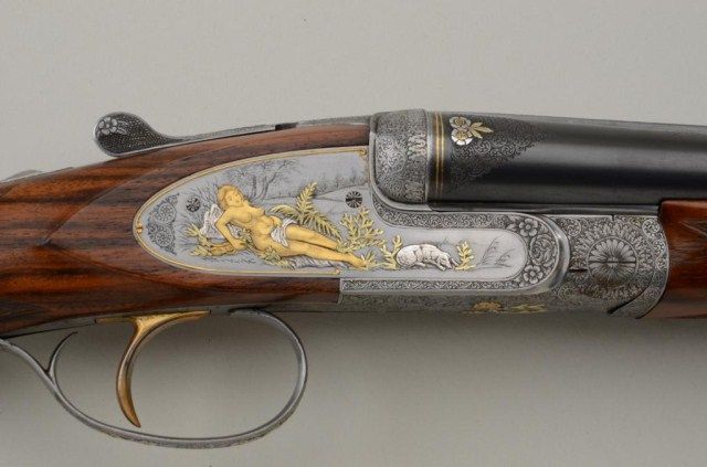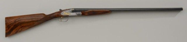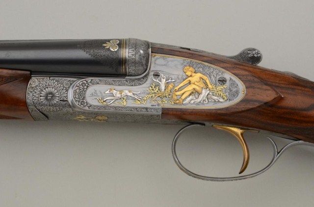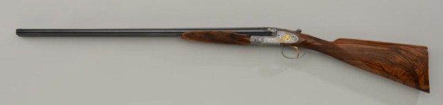 Francotte full side lock SxS 20 GA Shotgun with master engraving and custom gold inlay by Angelo Bee. 27-1/2 BBL’s choked full left, mod right. 14” to end of checkered butt, 2-3/8” drop at heel, 1-1/2” at comb.No cast, wall thickness O.K. (.22). Single trigger, auto ejector, raised and filed non vent rib. Scenes of “Diana” the huntress in multi-color gold surrounded by fine and intricate European scrolls. Excellent asre-conditioned by master gunsmith. Est.:$6,000-$12,000.