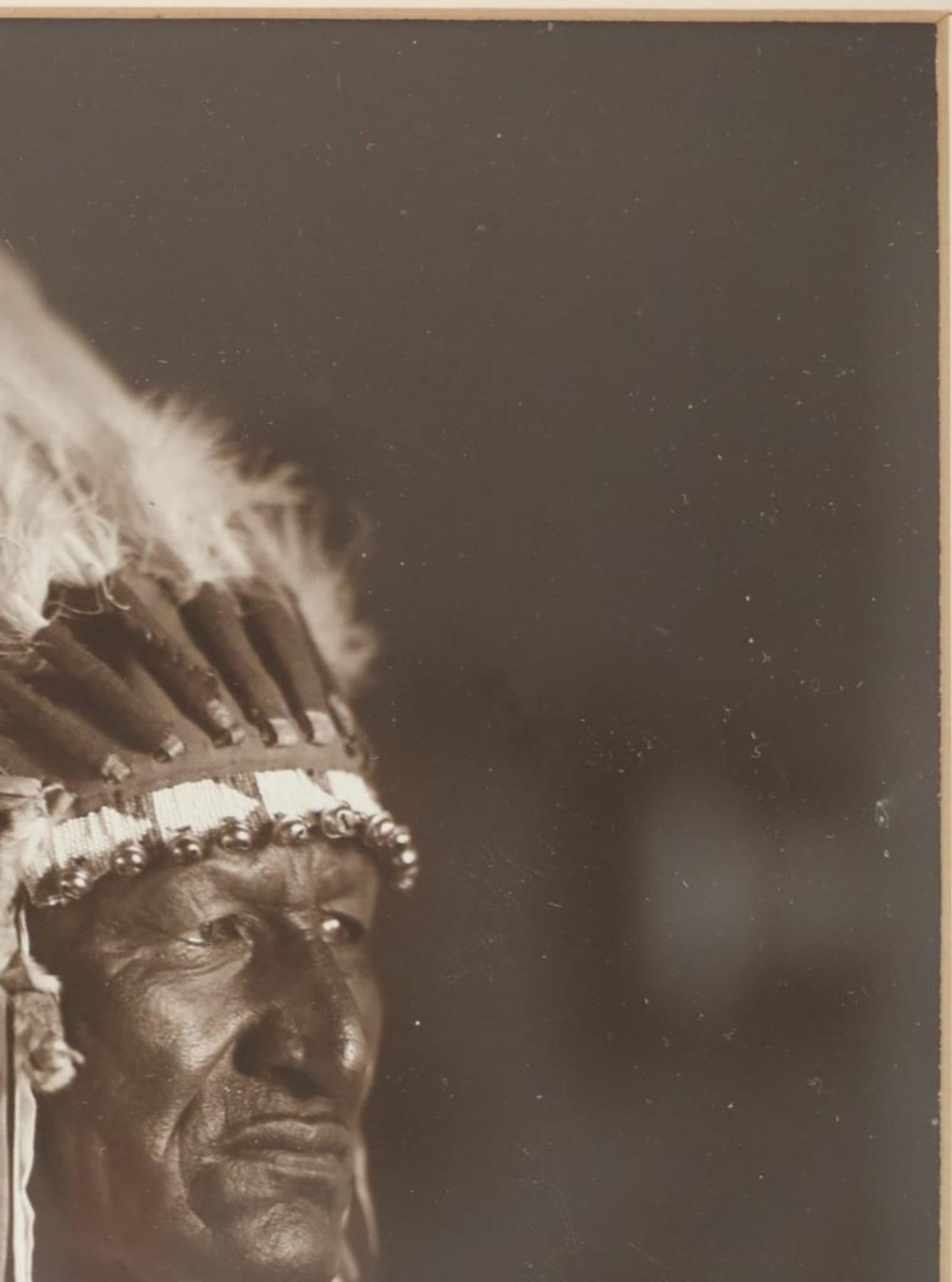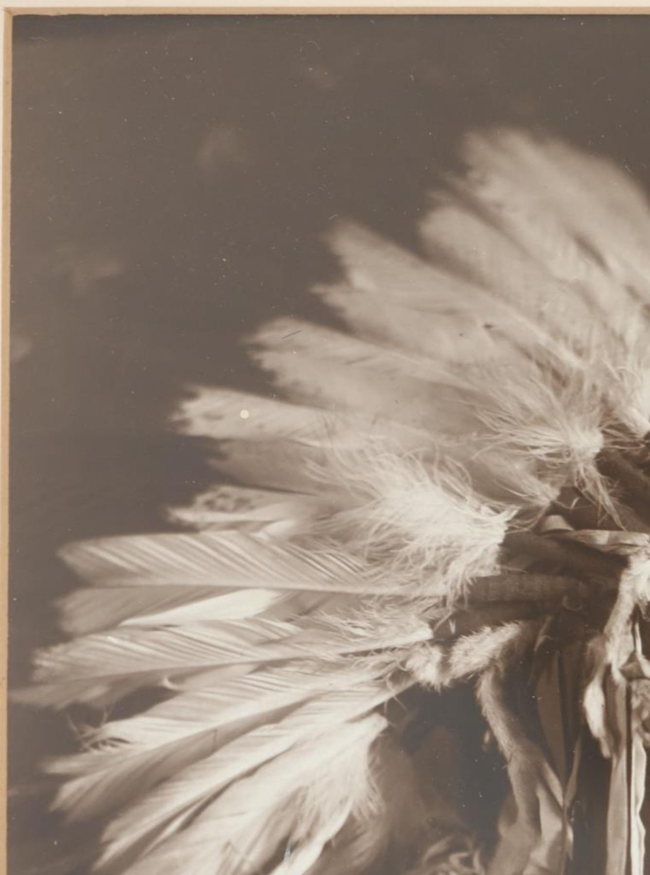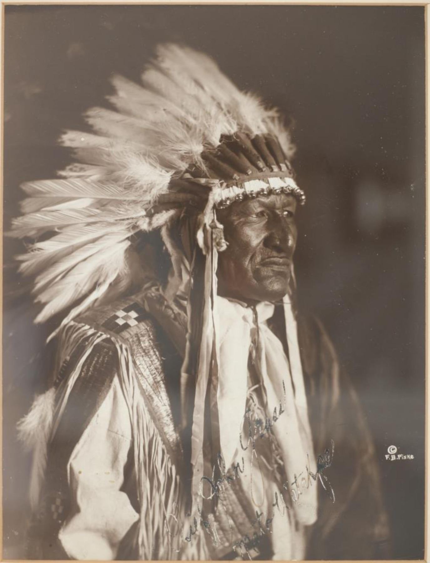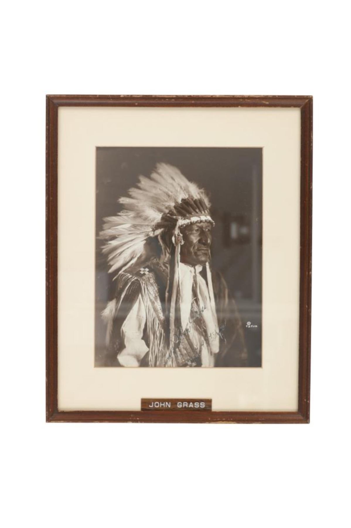 For your consideration is this Frank Bennett Fiske (1883-1952) photo of Chief John Grass originally taken circa 1890-1910s, from the ex-collection of the C.M. Russell Museum and John Kleinschmidt. Frank Bennett Fiske was an early photographer born at Fort Bennett in the Dakota Territory, spending most of his life in the Fort Yates area. He was best known for his rich, detailed portraits of Native American Indians, for which he won the North Dakota Art Award in 1950. Chief John Grass (1837-1918) was Chief of the Lakota Sioux, son of Pezi, a hereditary Lakota Chief. Grass would inherit the position from his father. His warrior name was Ma-tow-a-tak-pe, meaning Charging Bear, and he fought in the Battle of the Little Bighorn. Following Sitting Bull's surrender in 1881, Grass and Gall became rivals. In 1888, President Grover Cleveland met with Sitting Bull, Gall, and Grass to form the Standing Rock Agency, which was approved in 1889 despite Sitting Bull's opposition. Grass did not participate in the Ghost Dance, which resulted in the death of his rival Sitting Bull. Grass was Chief Justice of the Standing Rock Agency's Court of Indian Offenses in Fort Yates for over 30 years. Grass died on the Agency at about age 80 and was buried at Fort Yates in the Catholic cemetery. The photo shows a portrait of Chief John Grass in traditional wear and wearing a large feathered headdress. He is looking to the viewers right with a stoic look on his face. It is marked in the bottom right corner reading, "© F.B. Fiske" in white lettering and shows writing reading "Chief John Grass". It is matted once with white matting paper and features a tag on the front reading, "John Grass". The piece shows good condition overall with little to no wear present and no major signs of damage noted. The visible photo measures 8 3/4" L x 6 5/8" W, while the entire piece measures 13 1/4" L x 10 3/4" W x 7/8" D. It has a total weight of 1 pound and 4 ounces.
