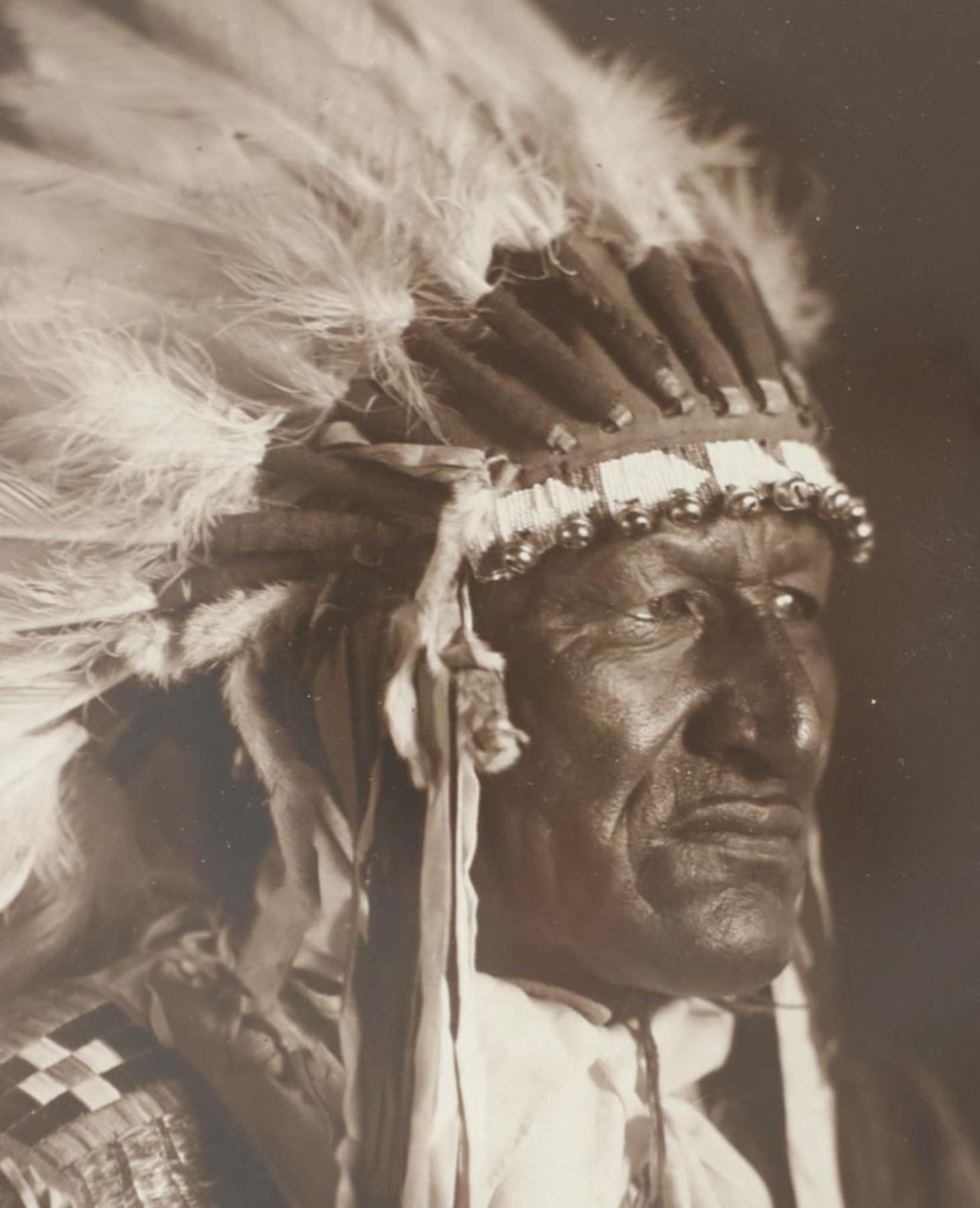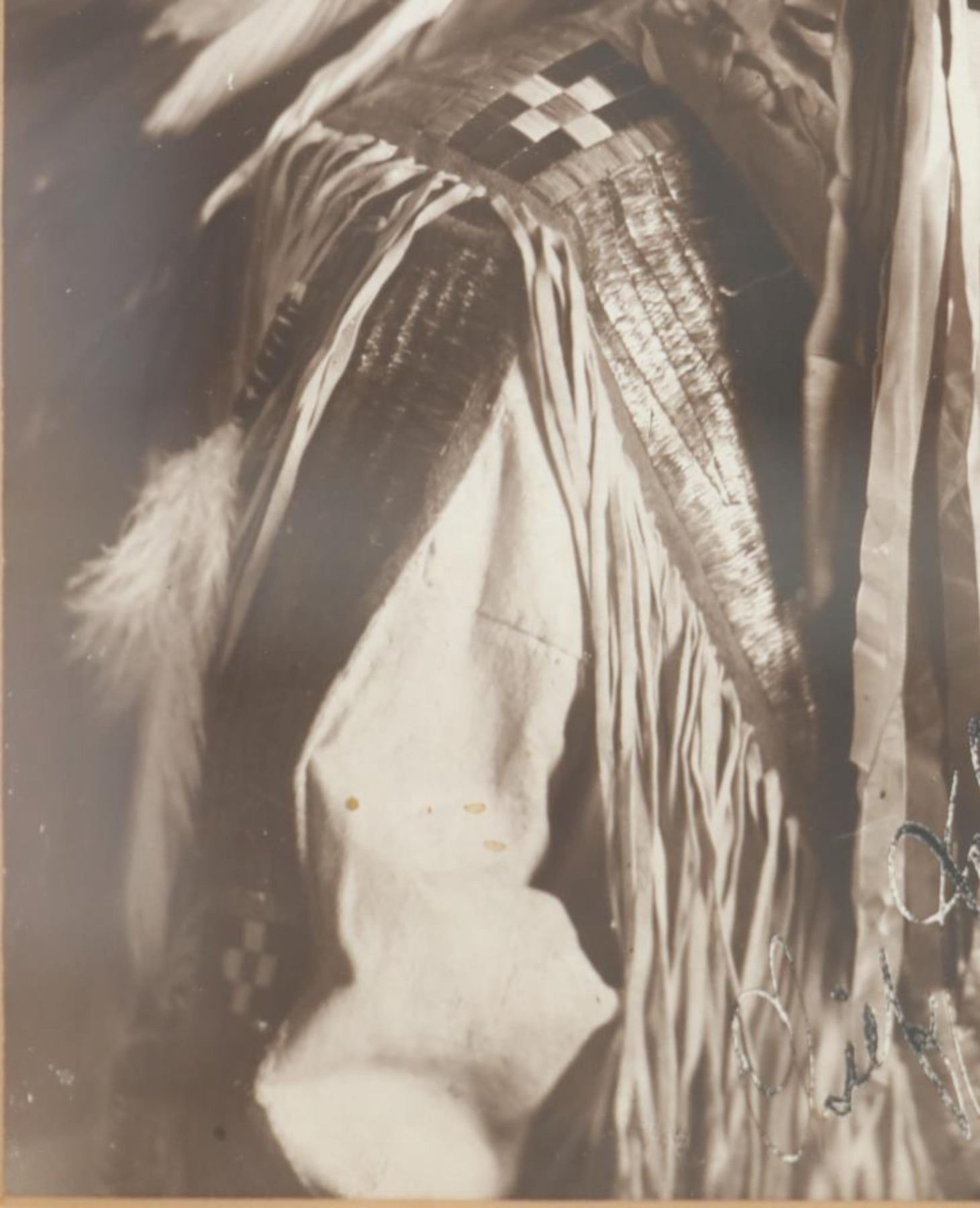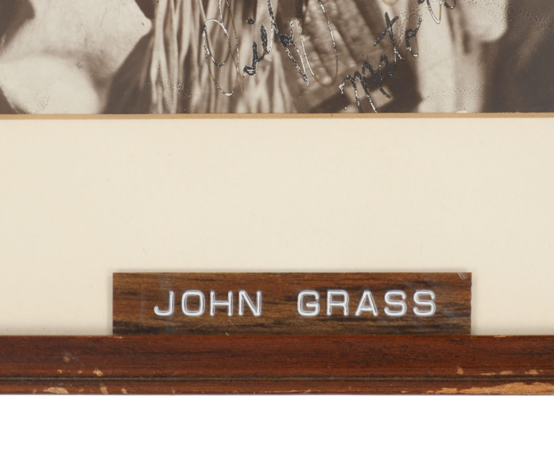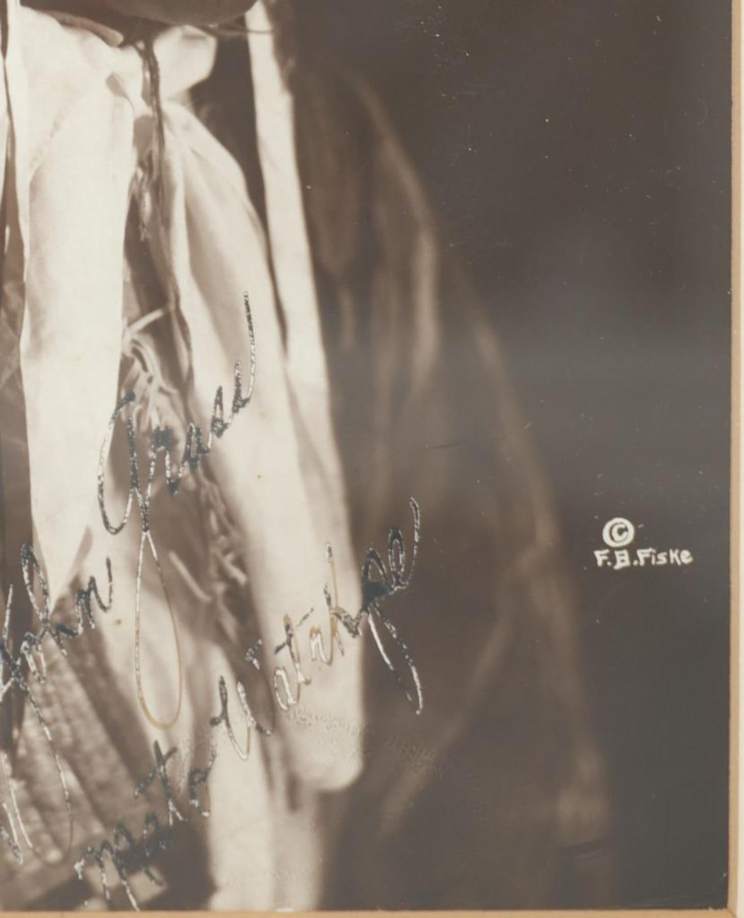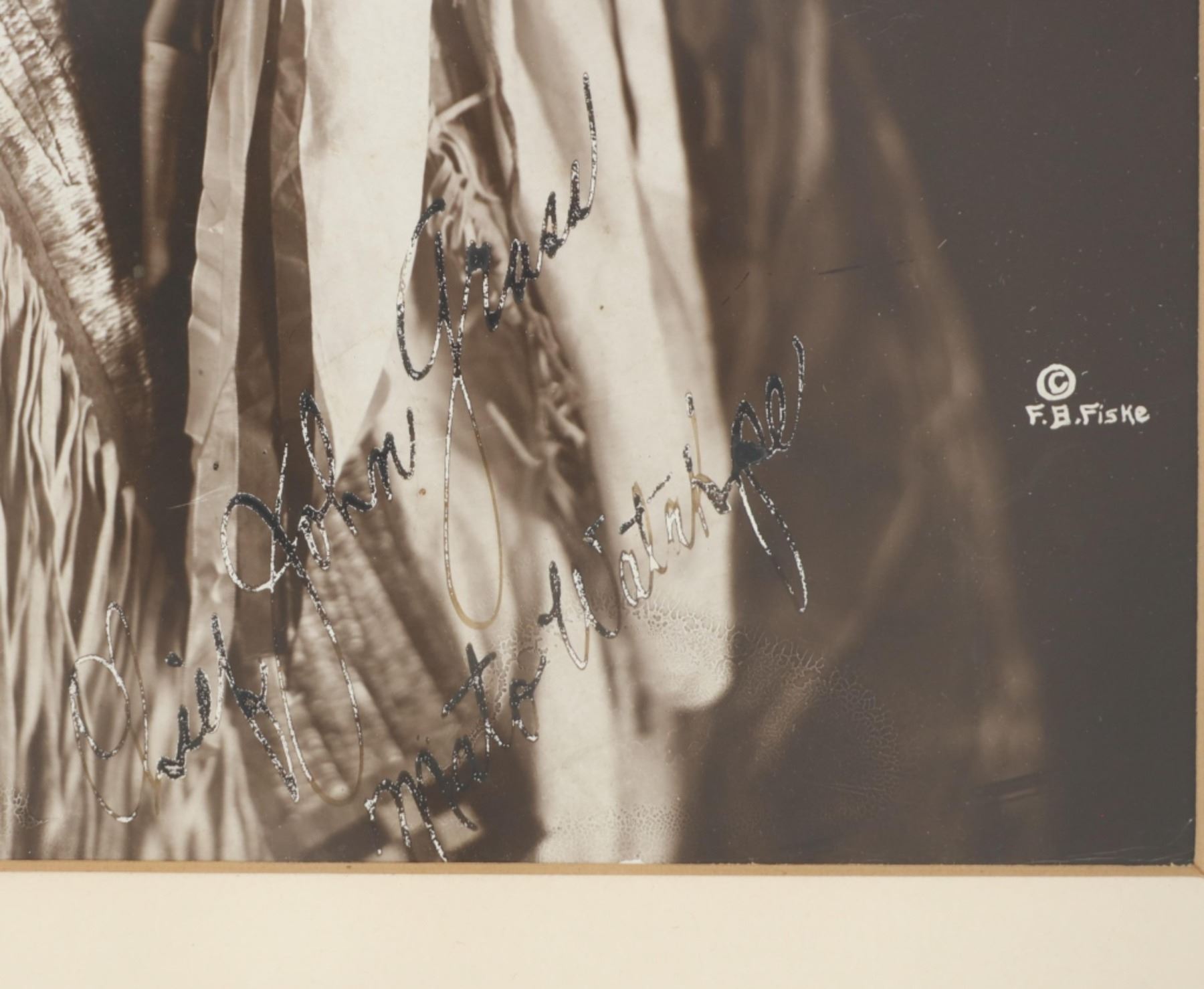 For your consideration is this Frank Bennett Fiske (1883-1952) photo of Chief John Grass originally taken circa 1890-1910s, from the ex-collection of the C.M. Russell Museum and John Kleinschmidt. Frank Bennett Fiske was an early photographer born at Fort Bennett in the Dakota Territory, spending most of his life in the Fort Yates area. He was best known for his rich, detailed portraits of Native American Indians, for which he won the North Dakota Art Award in 1950. Chief John Grass (1837-1918) was Chief of the Lakota Sioux, son of Pezi, a hereditary Lakota Chief. Grass would inherit the position from his father. His warrior name was Ma-tow-a-tak-pe, meaning Charging Bear, and he fought in the Battle of the Little Bighorn. Following Sitting Bull's surrender in 1881, Grass and Gall became rivals. In 1888, President Grover Cleveland met with Sitting Bull, Gall, and Grass to form the Standing Rock Agency, which was approved in 1889 despite Sitting Bull's opposition. Grass did not participate in the Ghost Dance, which resulted in the death of his rival Sitting Bull. Grass was Chief Justice of the Standing Rock Agency's Court of Indian Offenses in Fort Yates for over 30 years. Grass died on the Agency at about age 80 and was buried at Fort Yates in the Catholic cemetery. The photo shows a portrait of Chief John Grass in traditional wear and wearing a large feathered headdress. He is looking to the viewers right with a stoic look on his face. It is marked in the bottom right corner reading, "© F.B. Fiske" in white lettering and shows writing reading "Chief John Grass". It is matted once with white matting paper and features a tag on the front reading, "John Grass". The piece shows good condition overall with little to no wear present and no major signs of damage noted. The visible photo measures 8 3/4" L x 6 5/8" W, while the entire piece measures 13 1/4" L x 10 3/4" W x 7/8" D. It has a total weight of 1 pound and 4 ounces.