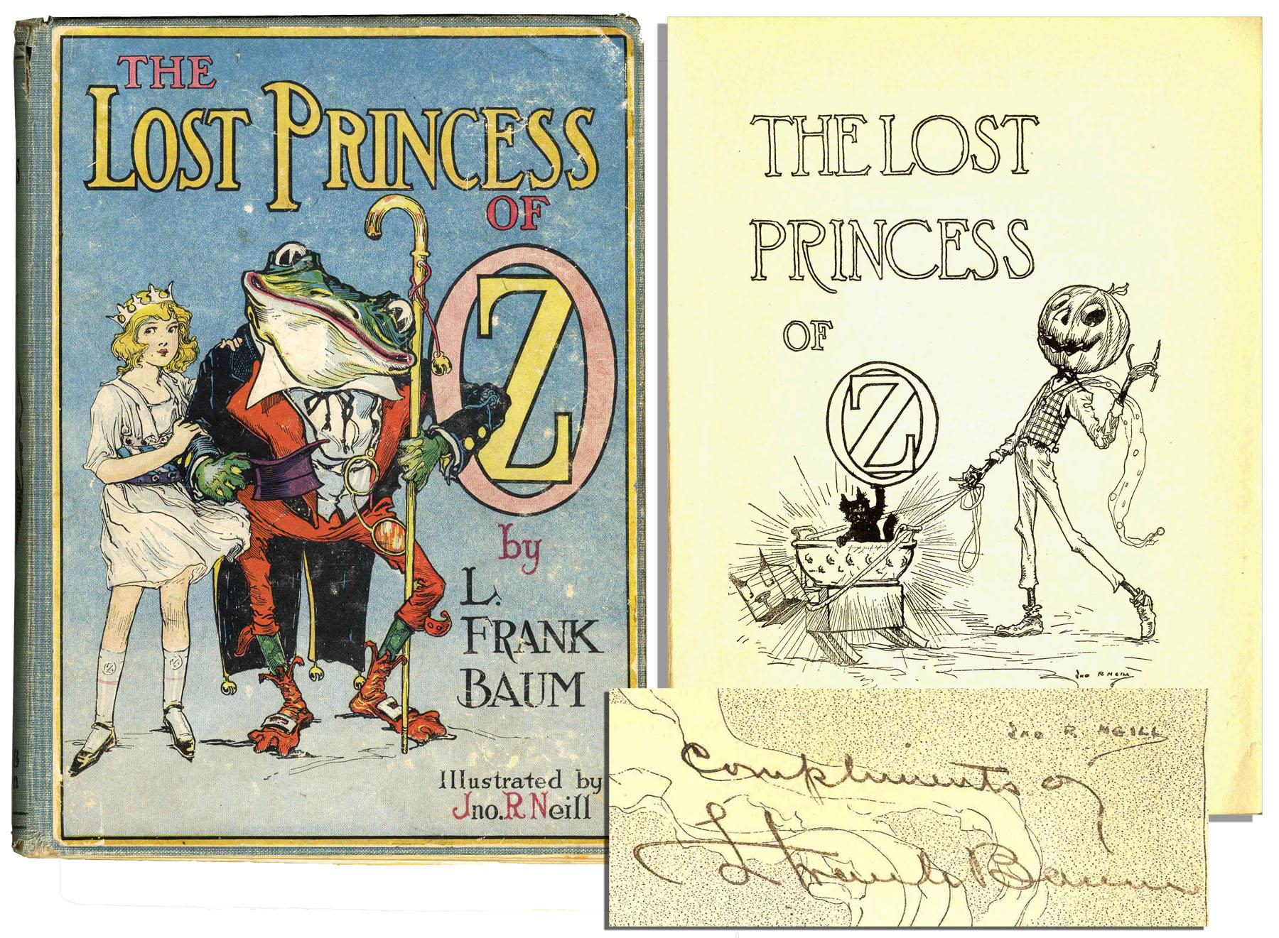Frank Baum signed first edition of ''The Lost Princess of Oz.'' The Reilly & Britton Co.: Chicago: 1917. This beautifully illustrated novel in the Oz series is signed by Baum on the front free endpaper, ''Compliments of L Frank Baum''. Lot is accompanied by a letter of authenticity from Corky Foote Olander, who previously owned the book and whose father acquired it from Shirley's father. Olander writes in the letter, ''…A neighborhood playmate of mine was Shirley Temple who I saw quite often…Because of Shirley's association with the movie studios, I am assuming that was the reason she had signed copies of most or all of the books. In any event, my parents and Shirley's were friends and Mr. Temple and my dad (Ray Foote) worked together on the Brentwood Park Homeowner's Association…Mr. Temple gave a copy to my dad to give to me…'' The book retains its original blue cloth boards and spine, and seven color plates, missing five of the original twelve. In fair to good condition, with spine nearly detached from book. Interior pages are clean with only one illustration colored in with crayon. 313pp. novel measures 7'' x 9.25''.