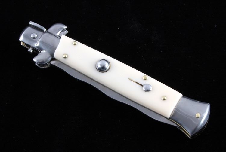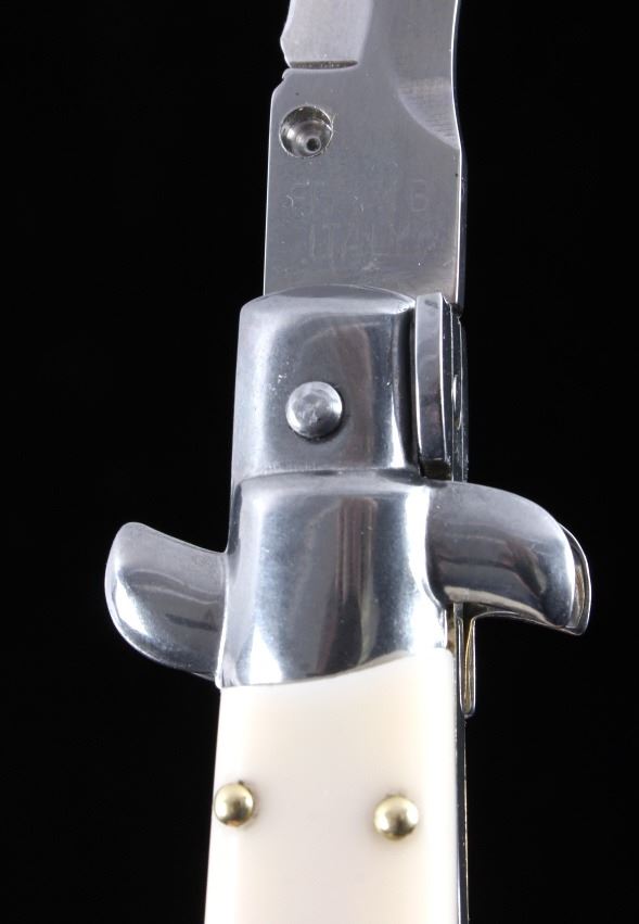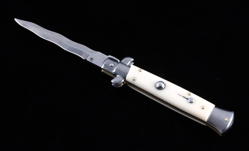 This is a Frank Beltrame Italian stiletto switchblade knife. The knife is marked "Frank B Italy" and features an ivory toned celluloid handle with a kriss blade. The knife shows very good condition. It measures 8.75" with a 3.75" blade.