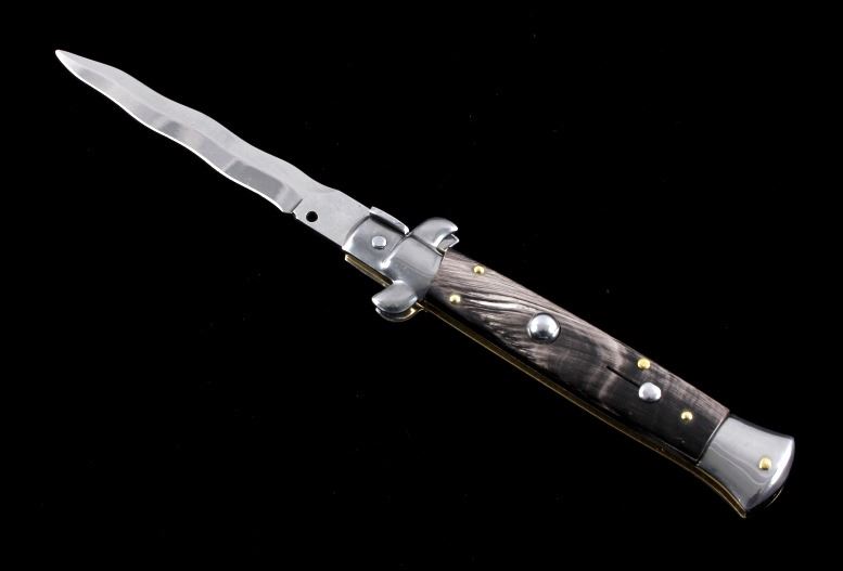 This is a Frank Beltrame stiletto switchblade knife with a buffalo horn handle. The knife features a kriss blade marked "Frank B. Italy". The switchblade knife is in very good condition with a strong spring action. The knife measures 8.75" with a 3.75" blade.