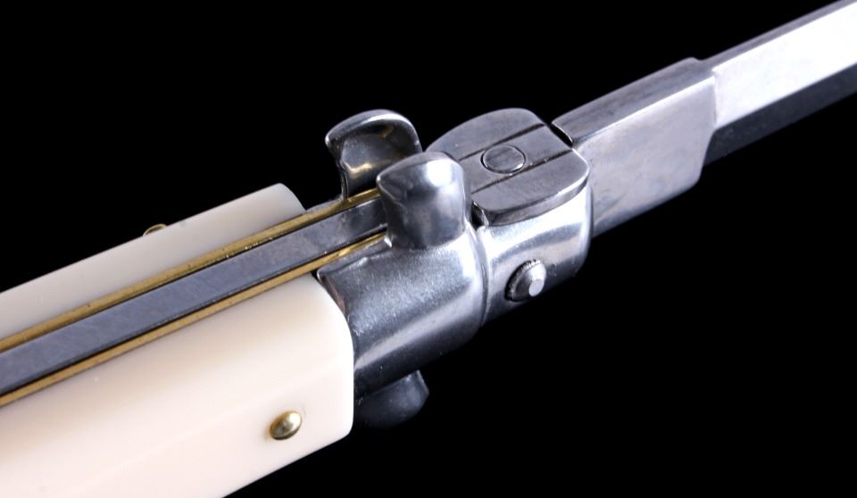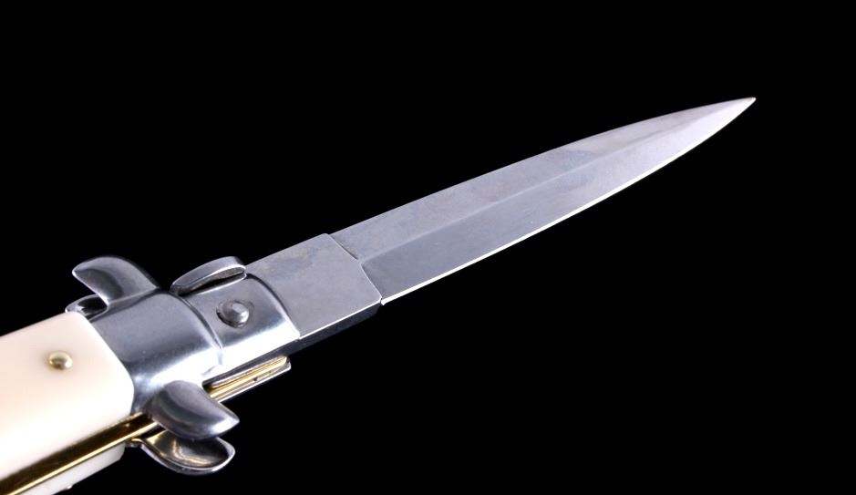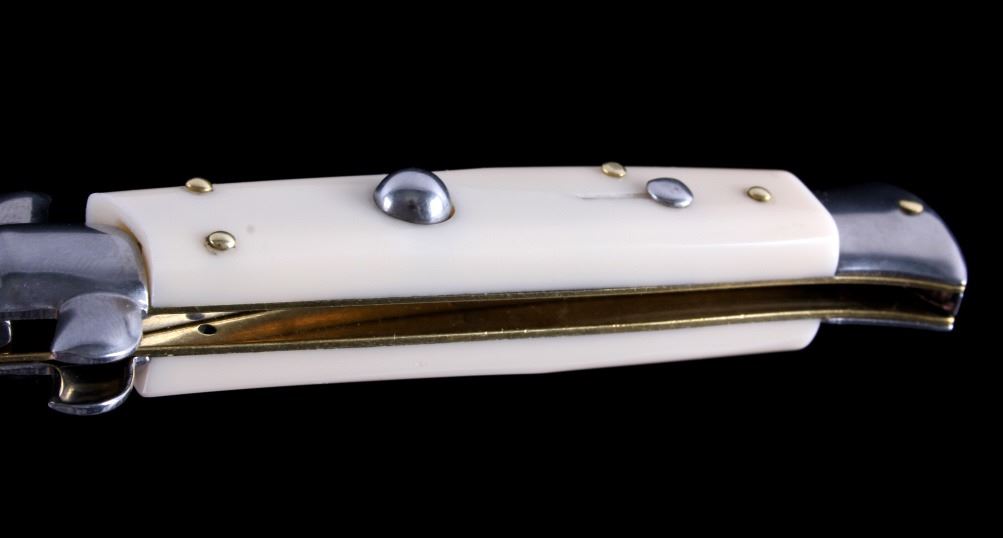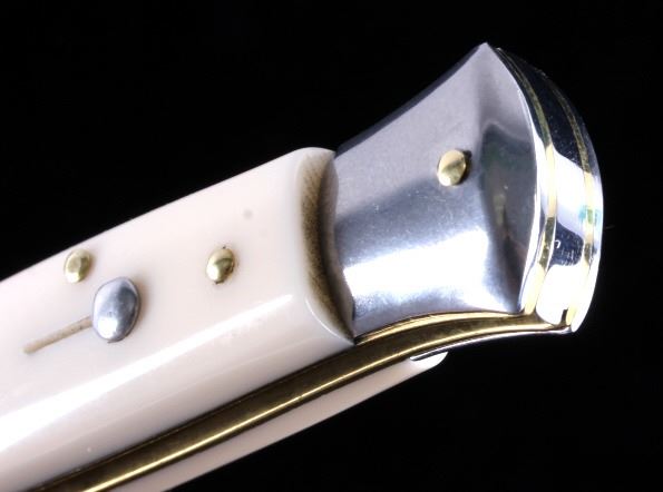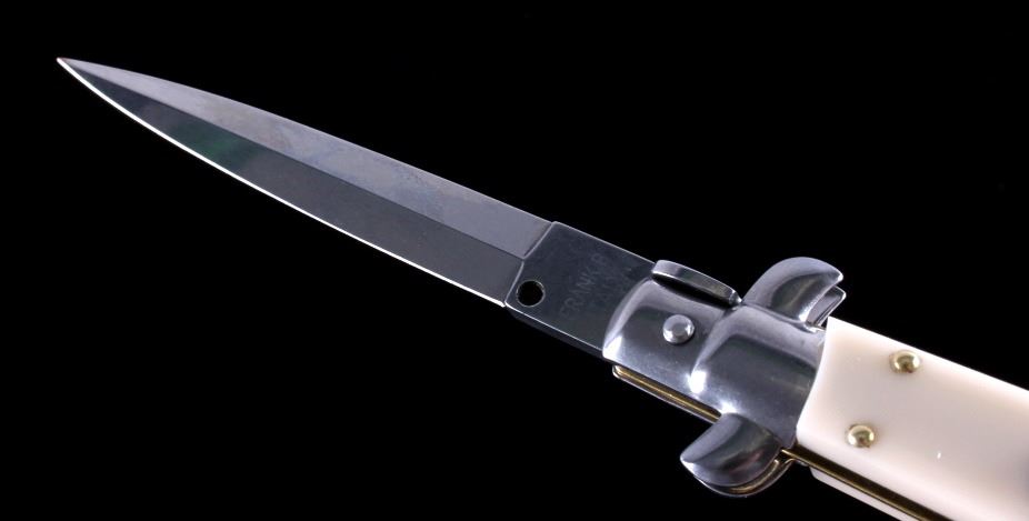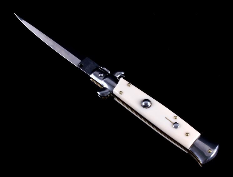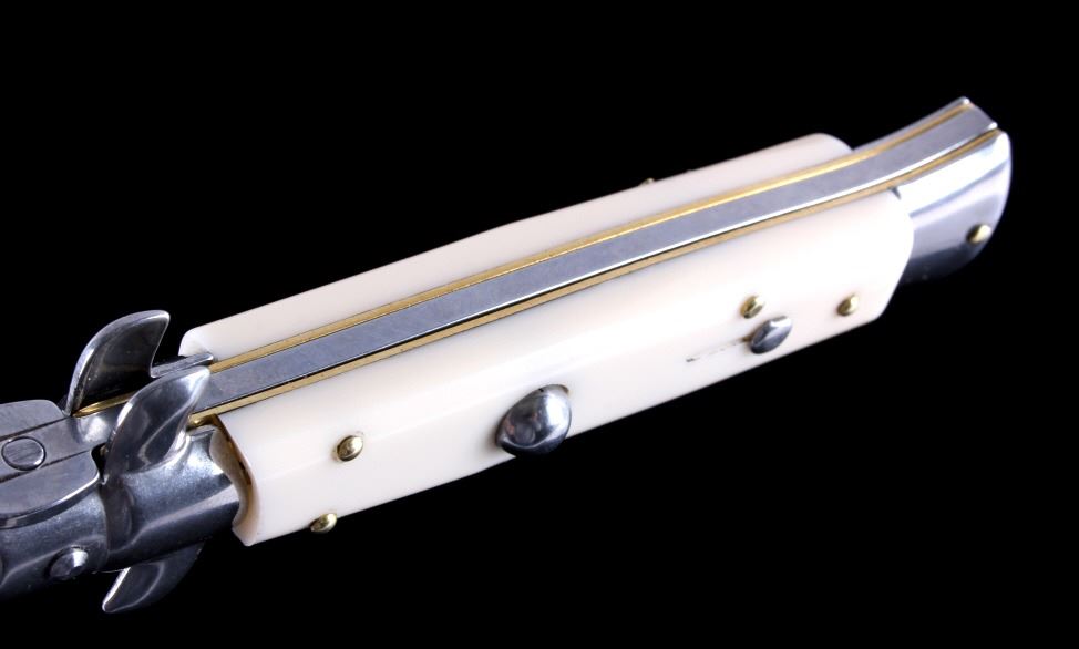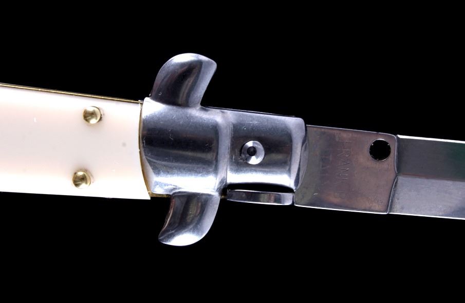 This is a Frank Beltrame Italian stiletto switchblade knife. The knife is marked "Frank B Italy" and features an ivory toned celluloid handle. The knife shows very good condition. It measures 9" with a 3.5" blade.