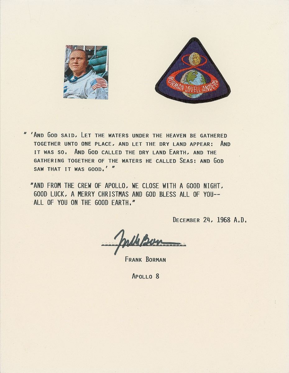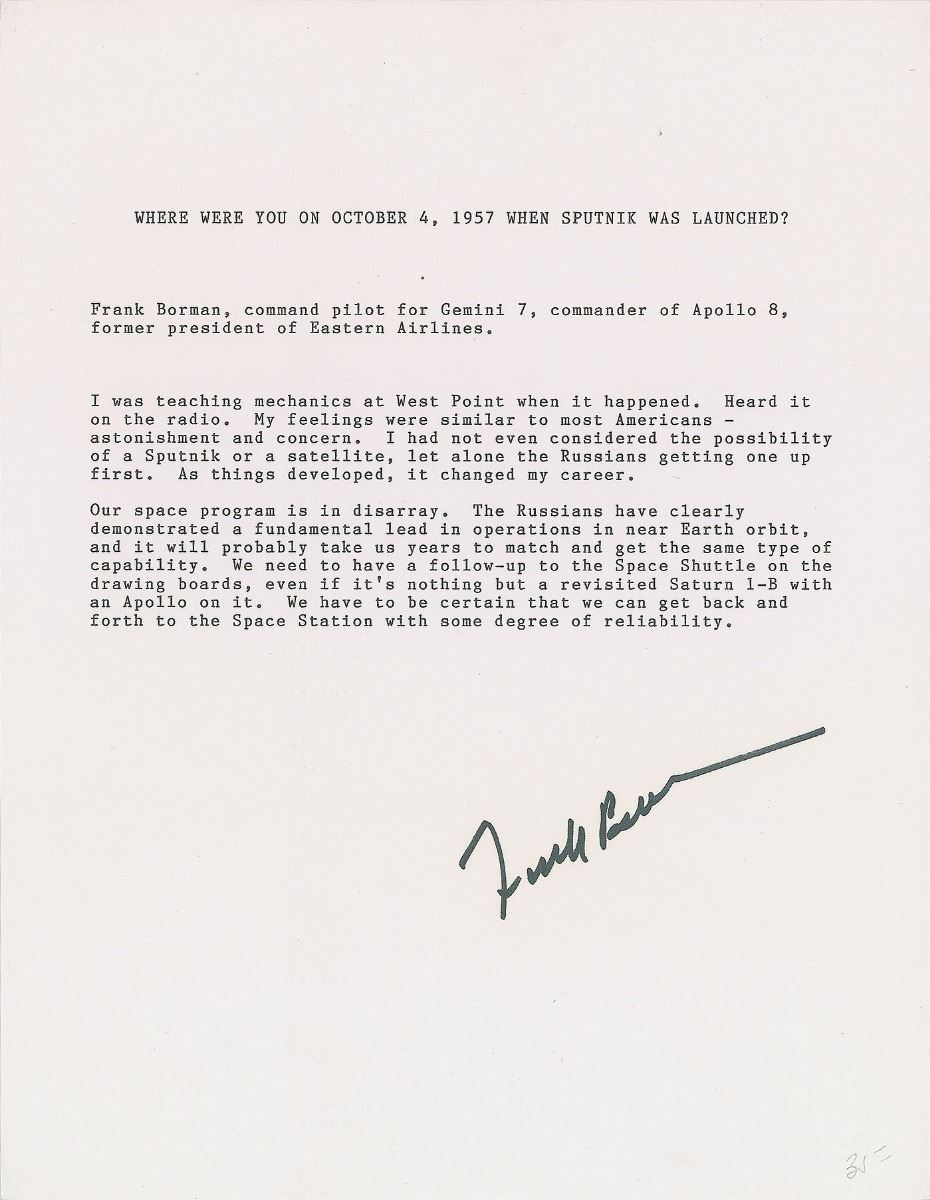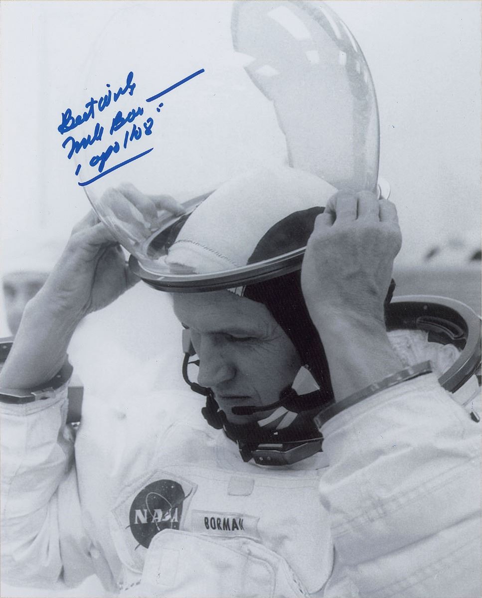 Three items: a glossy 8 x 10 photo of Borman putting on his helmet, signed in blue felt tip, “Best wishes, Frank Borman—Apollo 8”; a one-page souvenir typescript signed in black felt tip by Borman, describing where he was when Sputnik was launched in 1957; and a souvenir typescript of Borman’s comments while in orbit on Christmas Eve 1968, also signed in black felt tip. In overall fine condition. From the collection of aerospace memorabilia specialist Ken Havekotte.