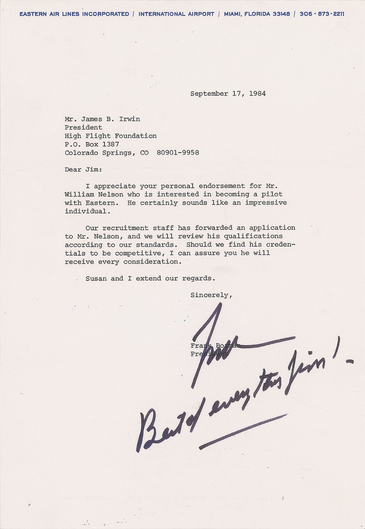 TLS signed “Frank,” one page, 7.25 x 10.5, Eastern Air Lines letterhead, September 17, 1984. Letter to fellow Apollo astronaut Jim Irwin, in full: "I appreciate your personal endorsement for Mr. William Nelson who is interested in becoming a pilot with Eastern. He certainly sounds like an impressive individual. Our recruitment staff has forwarded an application to Mr. Nelson, and we will review his qualifications according to our standards. Should we find his credentials to be competitive, I can assure you he will receive every consideration. Susan and I extend our regards." Below his signature, Borman handwrites: "Best of everything Jim!" In fine condition. Borman served as the CEO of Eastern Airlines from 1975 until his retirement in 1986. Correspondence between Apollo astronauts is seldom offered.