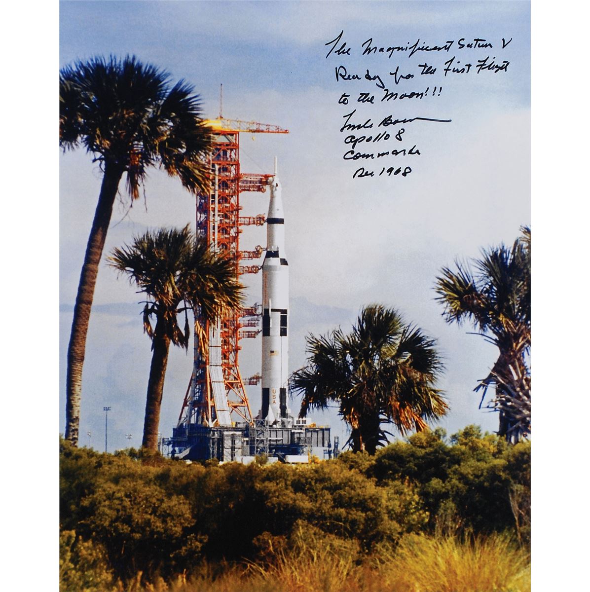 Color satin-finish 16 x 20 photo of the rollout for the Saturn V rocket, signed in black felt tip, “The magnificent Saturn V ready for its first flight to the moon!!! Frank Borman, Apollo 8, Commander, Dec. 1968.” In fine condition.