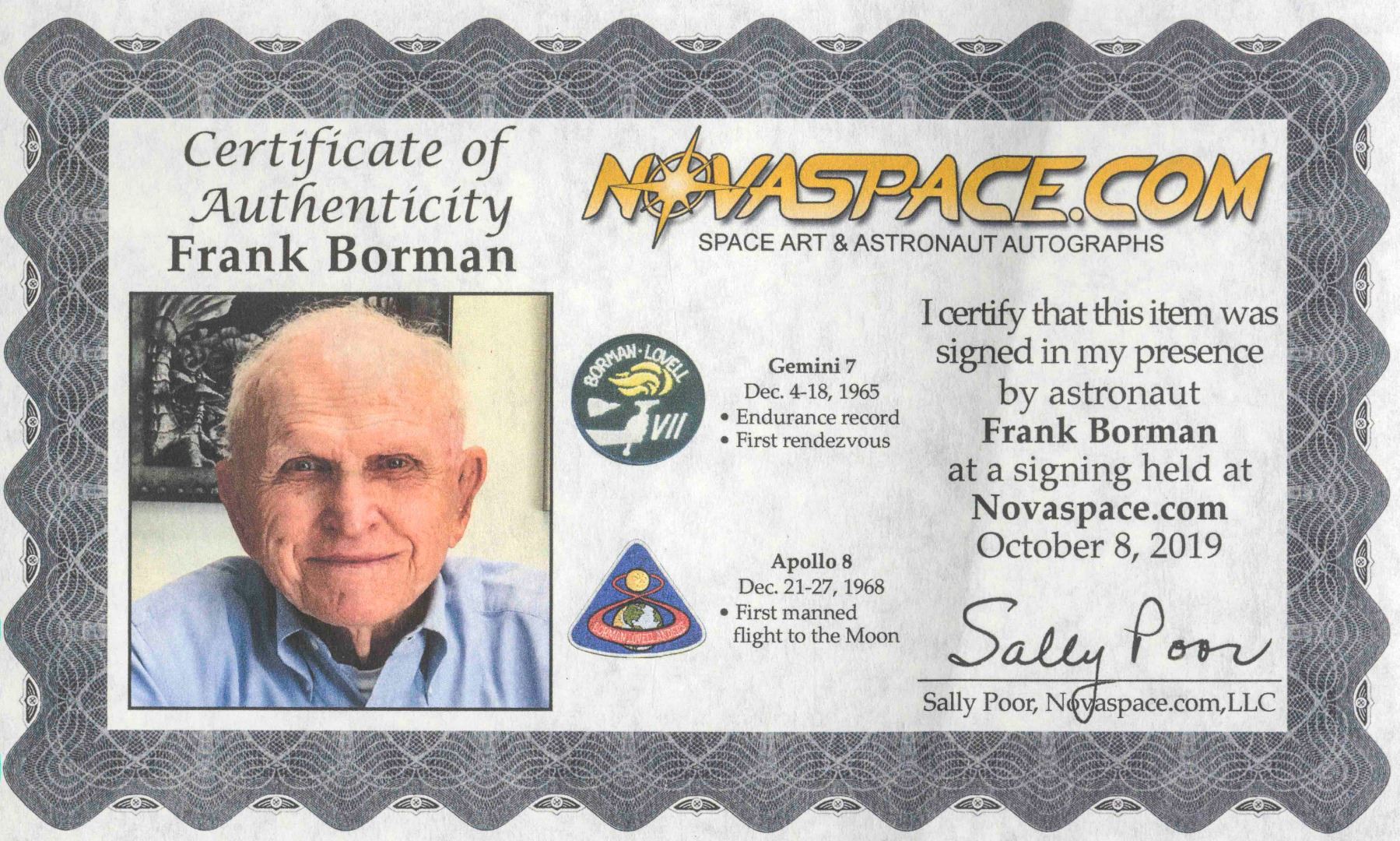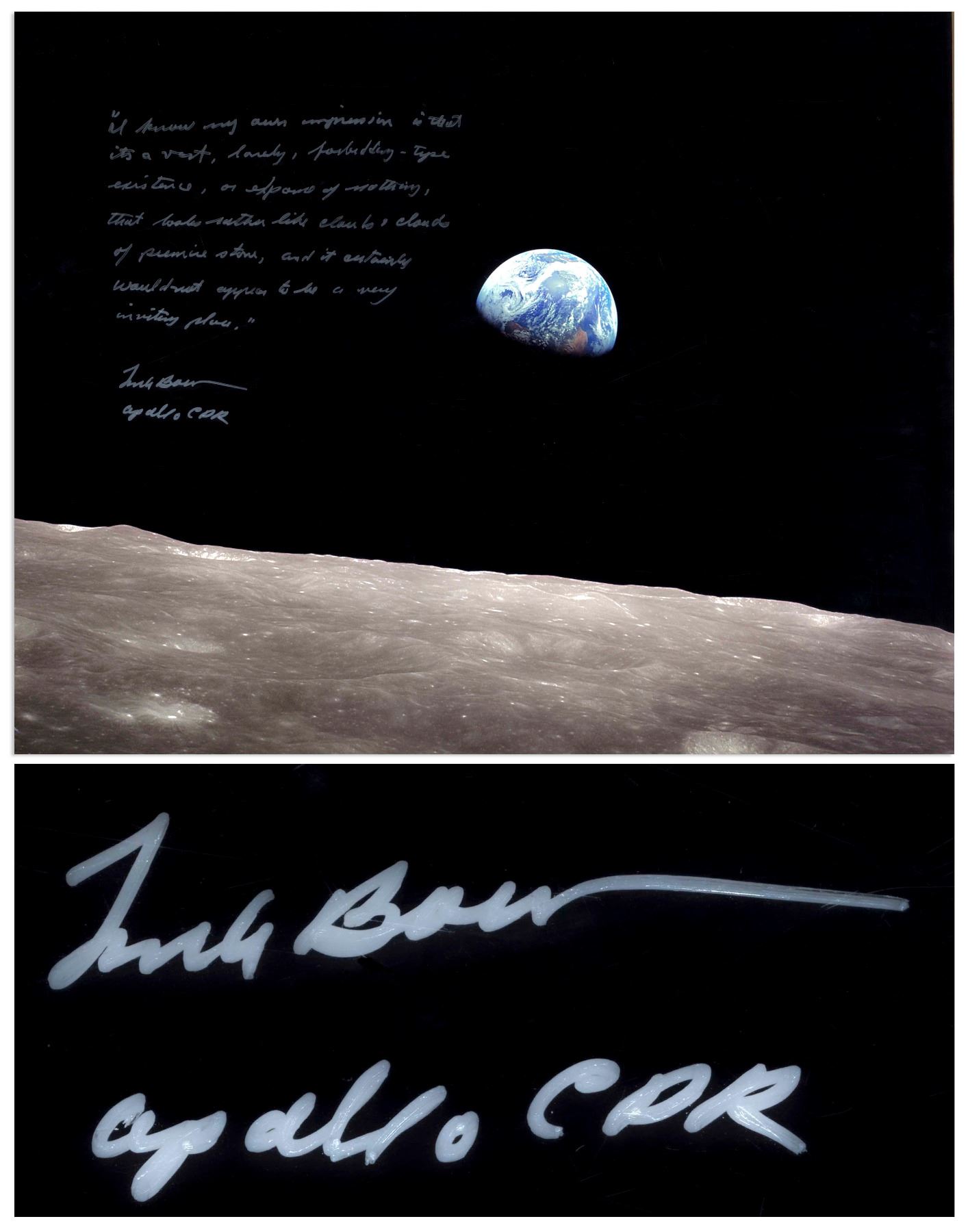 Frank Borman signed 20'' x 16'' ''Earthrise'' photo, showing Earth as seen from the moon during the Apollo 8 mission where Borman served as Commander. Borman writes his famous statement about the moon, '''I know my own impression is that it's a vast, lonely, forbidding-type existence, or expanse of nothing, that looks rather like clouds & clouds of pumice stone, and it certainly would not appear to be a very inviting place / Frank Borman / Apollo CDR''. Glossy photo is in near fine condition. With a COA from Novaspace.