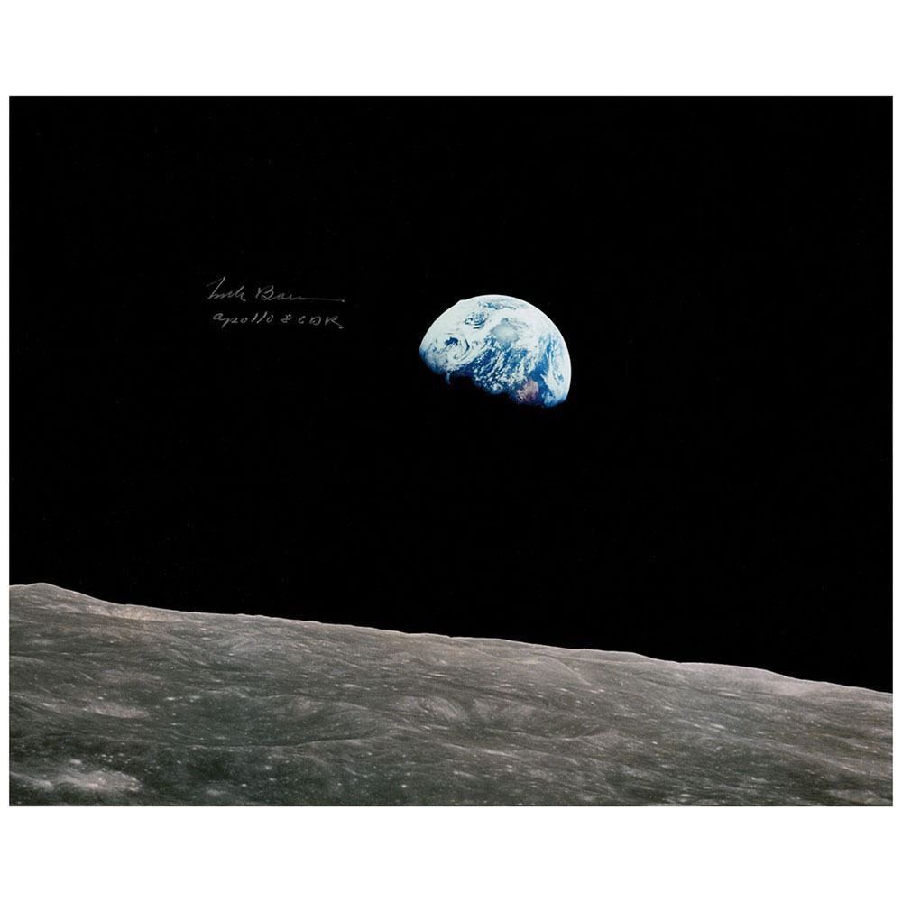 Color satin-finish 20 x 16 photo of the iconic 'Earthrise' image taken by Bill Anders during the Apollo 8 mission, signed in silver ink by the mission commander, "Frank Borman, Apollo 8 CDR." In fine condition. Accompanied by a certificate of authenticity from Novaspace.