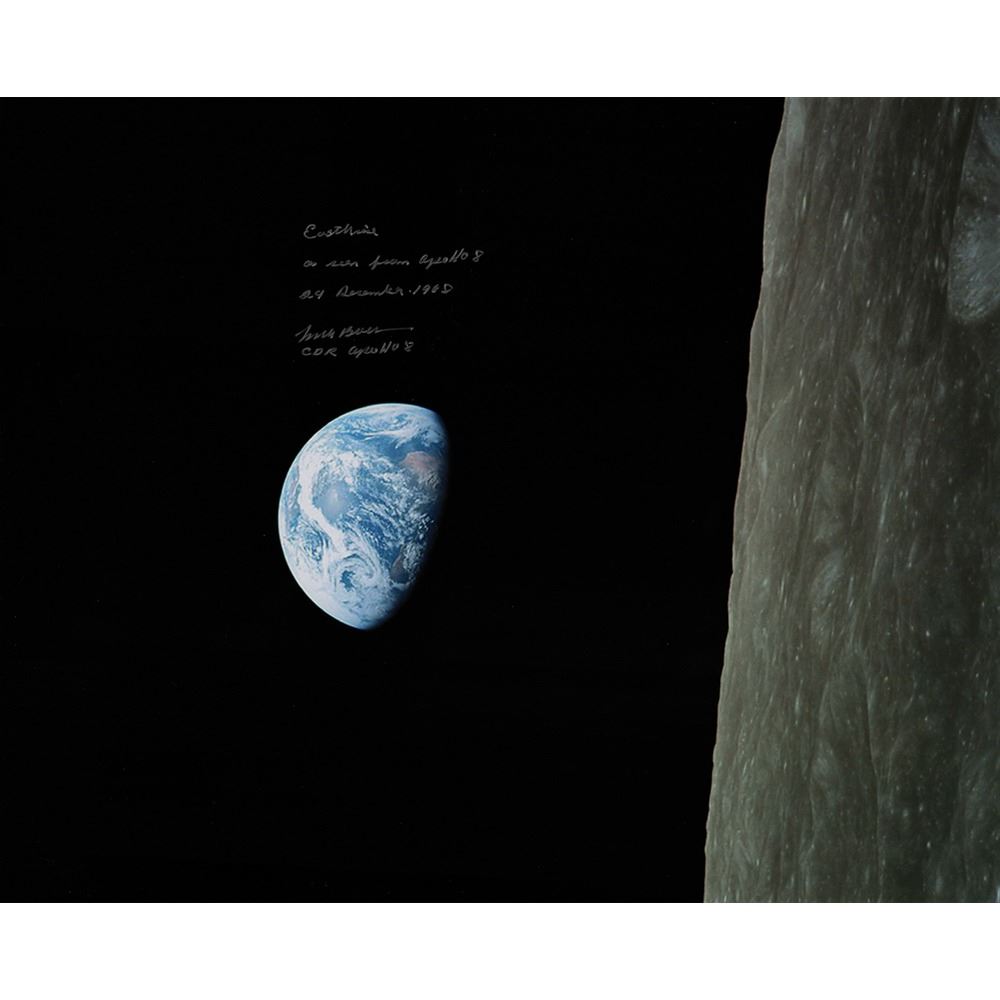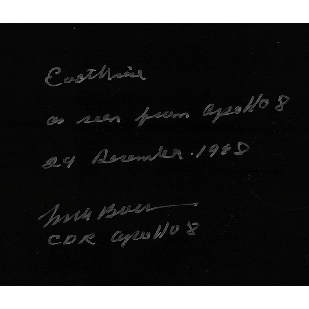 Striking color glossy 20 x 16 photo of planet Earth as viewed from the moon, signed in silver ink, "Earthrise as seen from Apollo 8, 29 December 1968, Frank Borman, CDR Apollo 8." In fine condition.