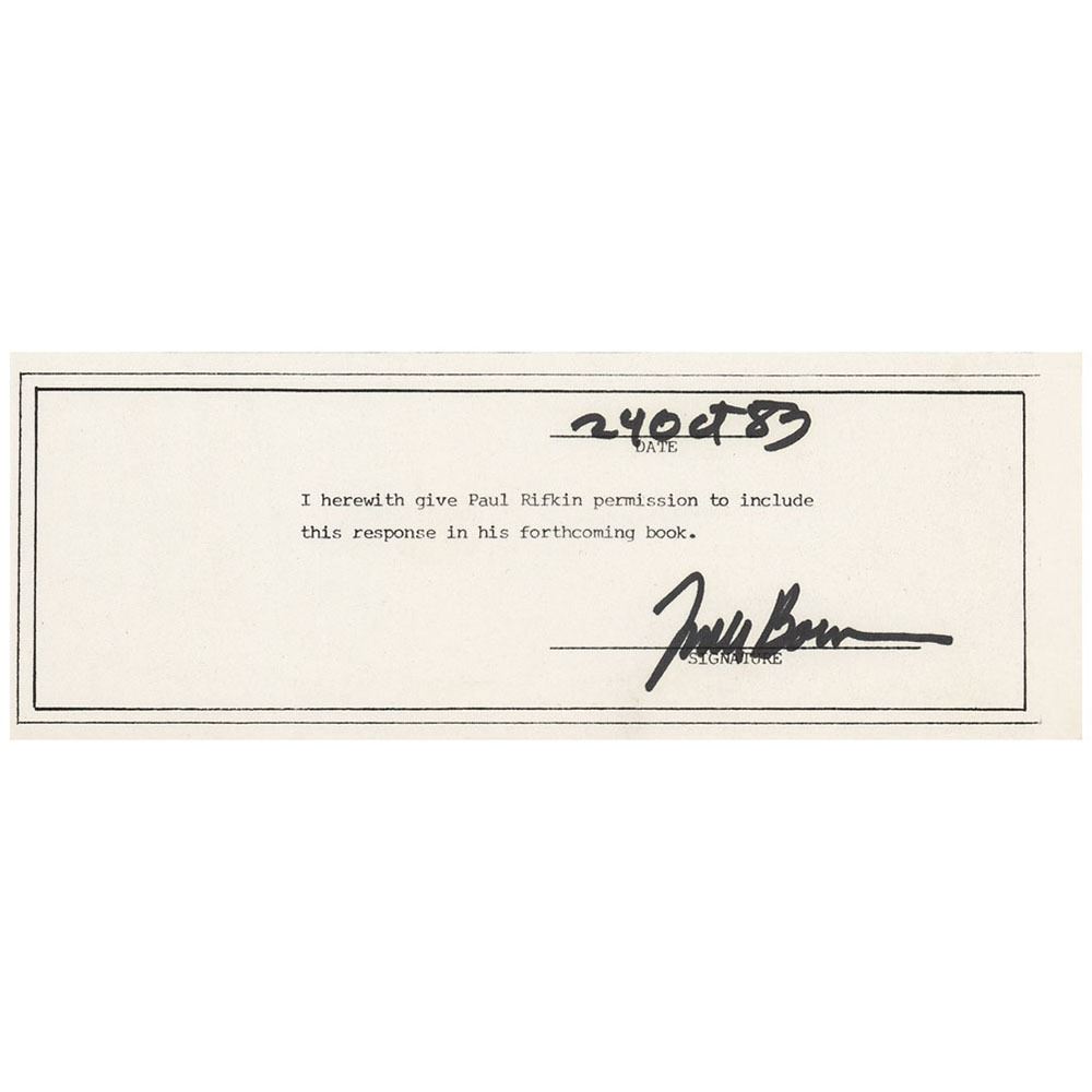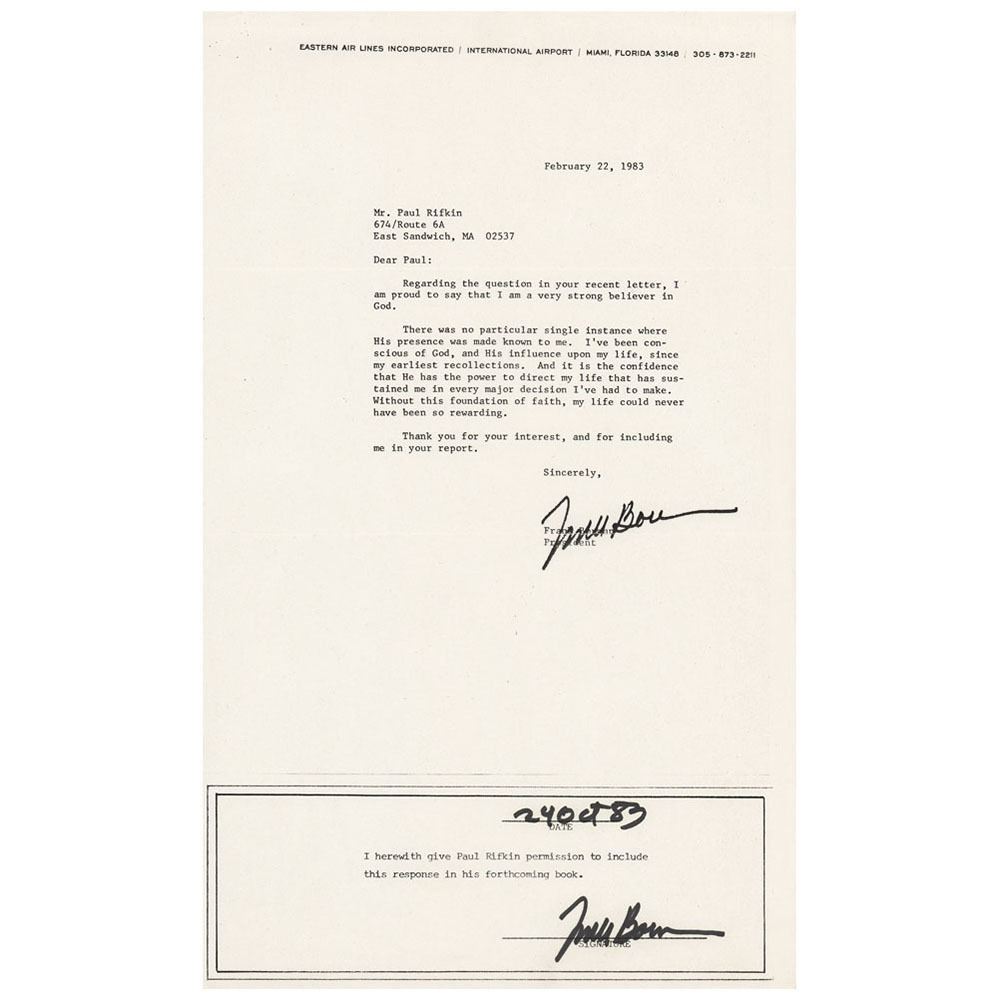 Permission slip signed “Frank Borman,†one page, 8.5 x 14, October 24, 1983, reproducing his letter of February 22, 1983, to Paul Rifkin. The original letter read, in full: "Regarding the question in your recent letter, I am proud to say that I am a very strong believer in God. There was no particular single instance where His presence was made known to me. I’ve been conscious of God, and His influence upon my life, since my earliest recollections. And it is the confidence that He has the power to direct my life that has sustained me in every major decision I’ve had to make. Without this foundation of faith, my life could never have been so rewarding. Thank you for your interest, and for including me in your report.†Borman’s reproduced signature is printed below. The authentically signed permission slip at the bottom reads: "I herewith give Paul Rifkin permission to include this response in his forthcoming book." In fine condition.